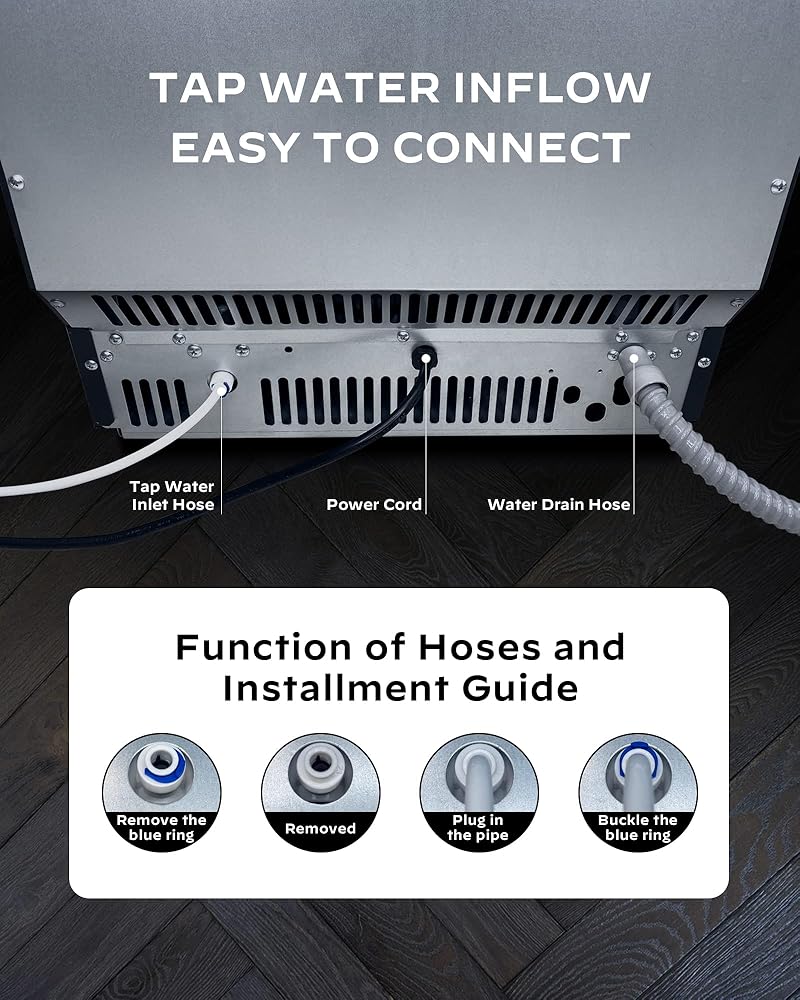 Easy to Operate: One simple panel makes the commercial ice machine easy to operate. Adjusting the timer results in thin, medium, or thick ice cubes. When water runs out, an alarm will sound to alert for refill. The self-cleaning function helps to keep the under counter ice maker working properly.