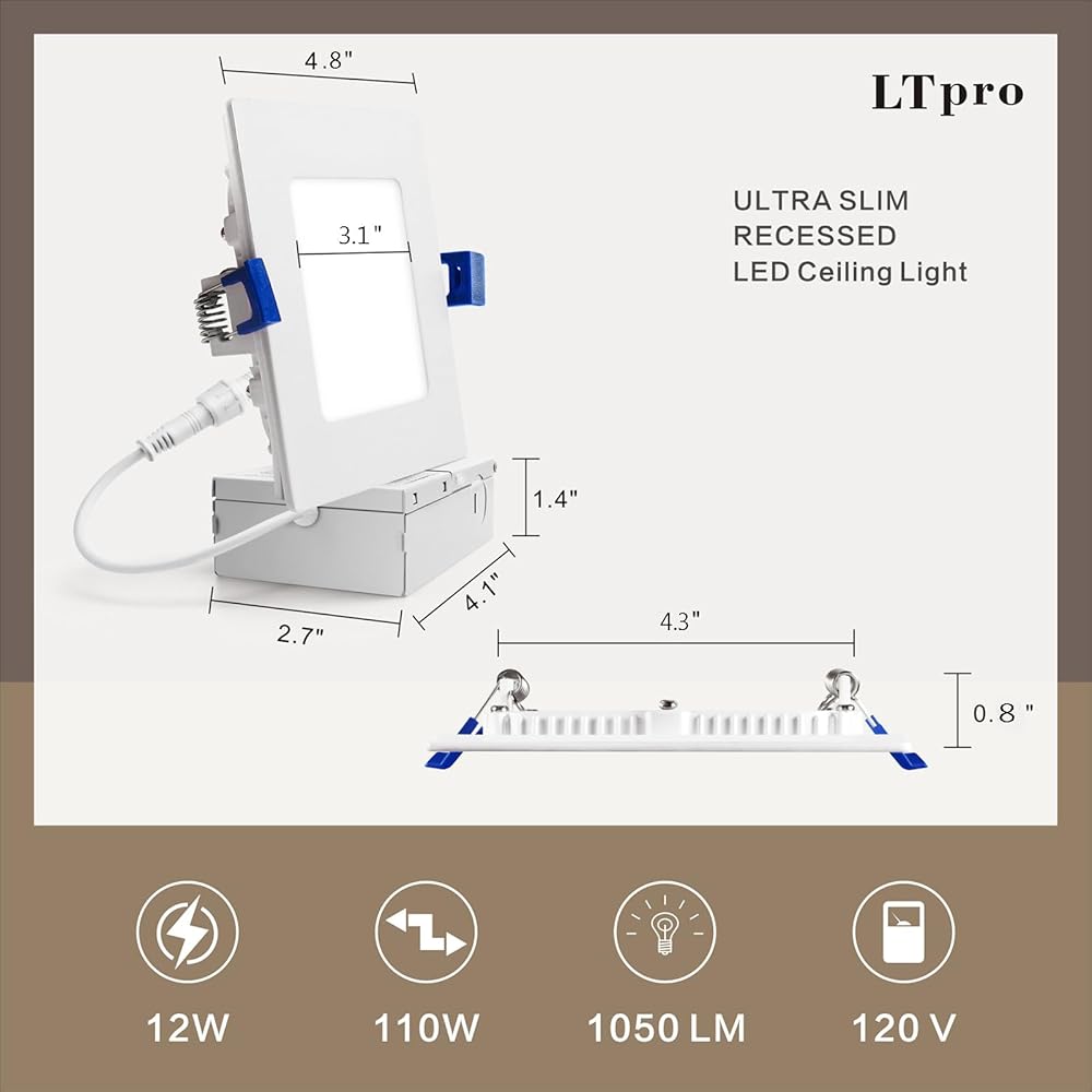 SAFETY FOR USE:This 4inch Square led panel lights you can confidently install these lights in direct contact with insulation materials. Scientific shell design, anti glare and scratch resistant. Rugged aluminum housing ensures corrosion resistance and excellent heat dissipation.Featuring an integrated IC rated junction box, mount holes, Snap In clips, and water resistant twist connectors.