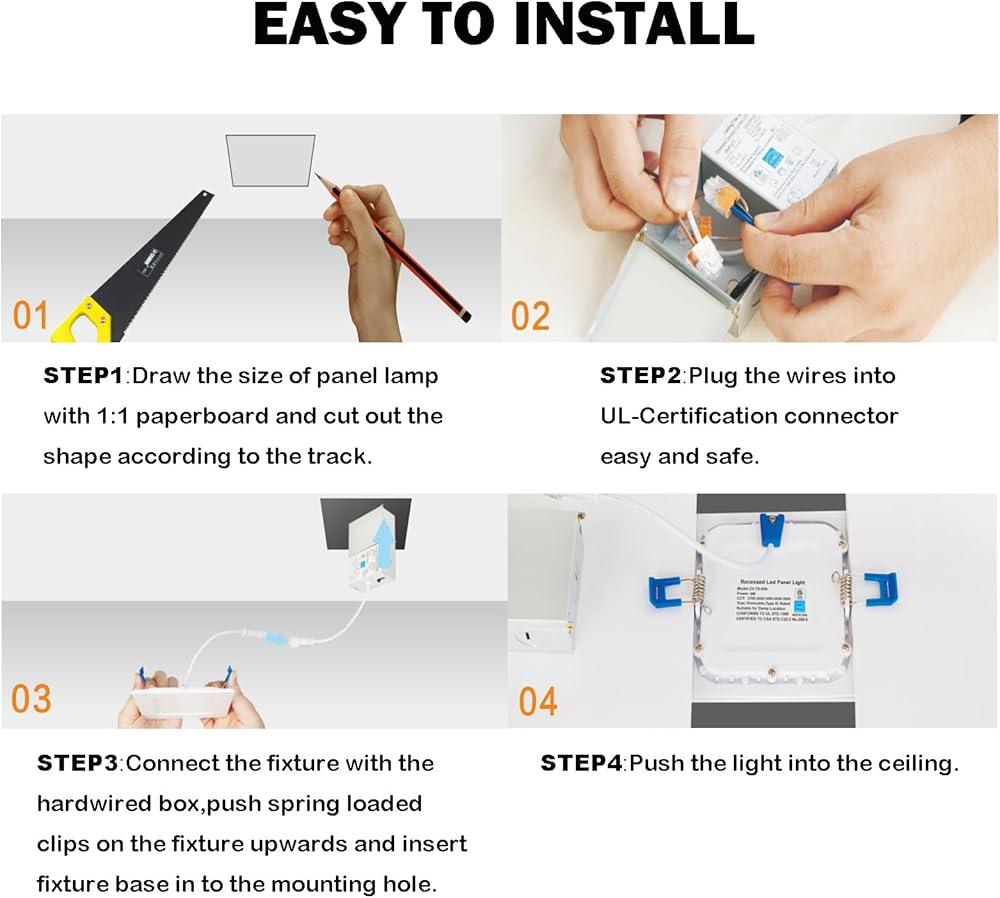 EFFORTLESS CANLESS INSTALLATION: The 5CCT Ultra Thin Square Led Ceiling Light Recessed Ceiling Lighting providing versatility and compatibility with various ceiling structures. The square led ceiling light can be used in new construction mounting plates.And the Square LED Lights come with Junction Box, just connect to the light with home cable & use spring clip to fix it on the ceiling, installation only takes a few minutes.