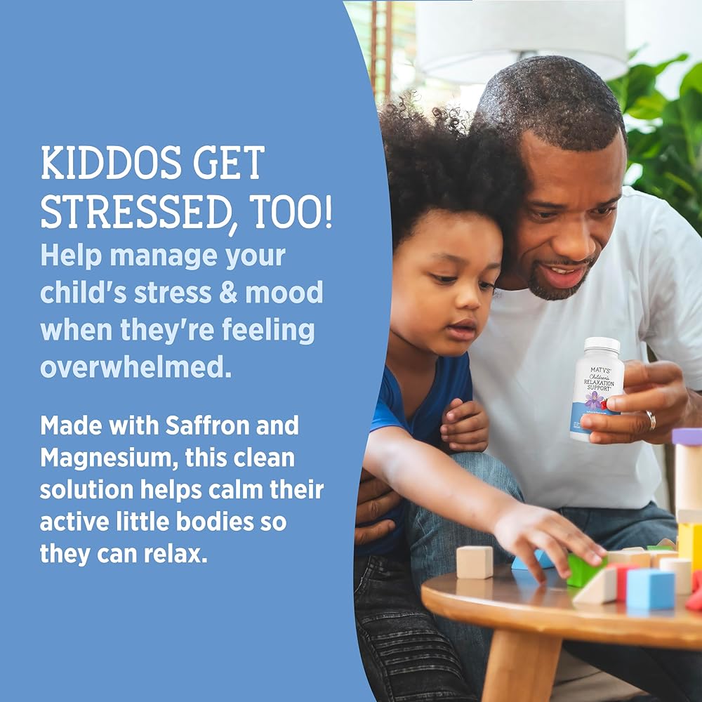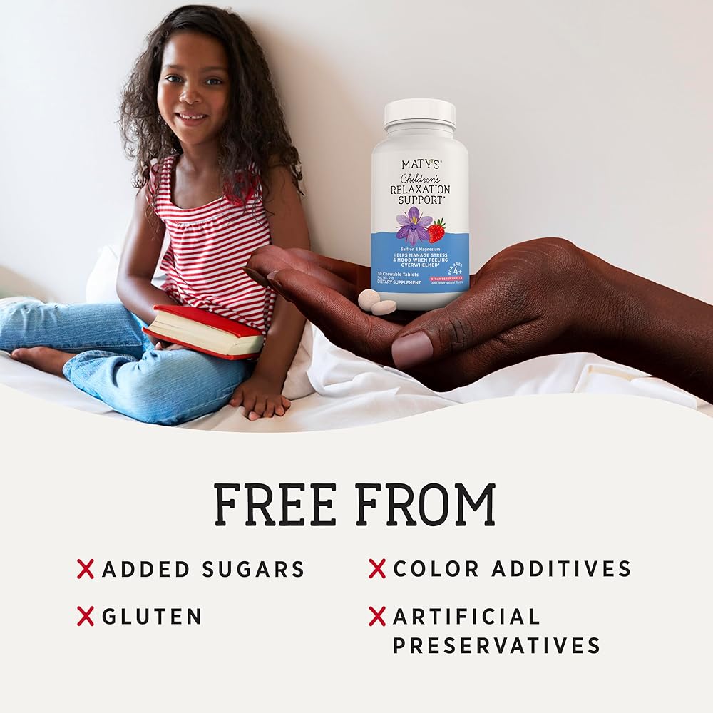 CALM THE CHAOS: From school stress to social pressures to digital overload, today's kids face many stressors. Matys Children's Relaxation Support Chewables provide natural support for children struggling to unwind, whether it's after a long day of homework or during quiet moments of relaxation. Formulated with Saffron and Magnesium, these chewables assist in managing your child's stress and mood when they feel overwhelmed, promoting a sense of calm and focus.