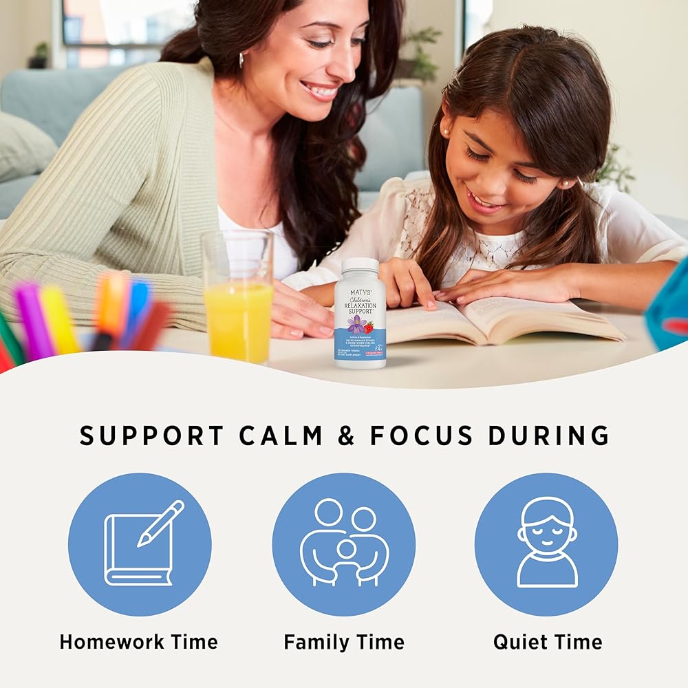 NO WORRIES, NON-HABIT FORMING: Parents seeking a safe supplement for their children will appreciate that Maty's chewable tablets are non-habit forming, melatonin-free, offering peace of mind during times of stress or difficulty winding down. Gentle reassurance for the whole family, making it an essential staple in any parent's toolkit or medicine cabinet.