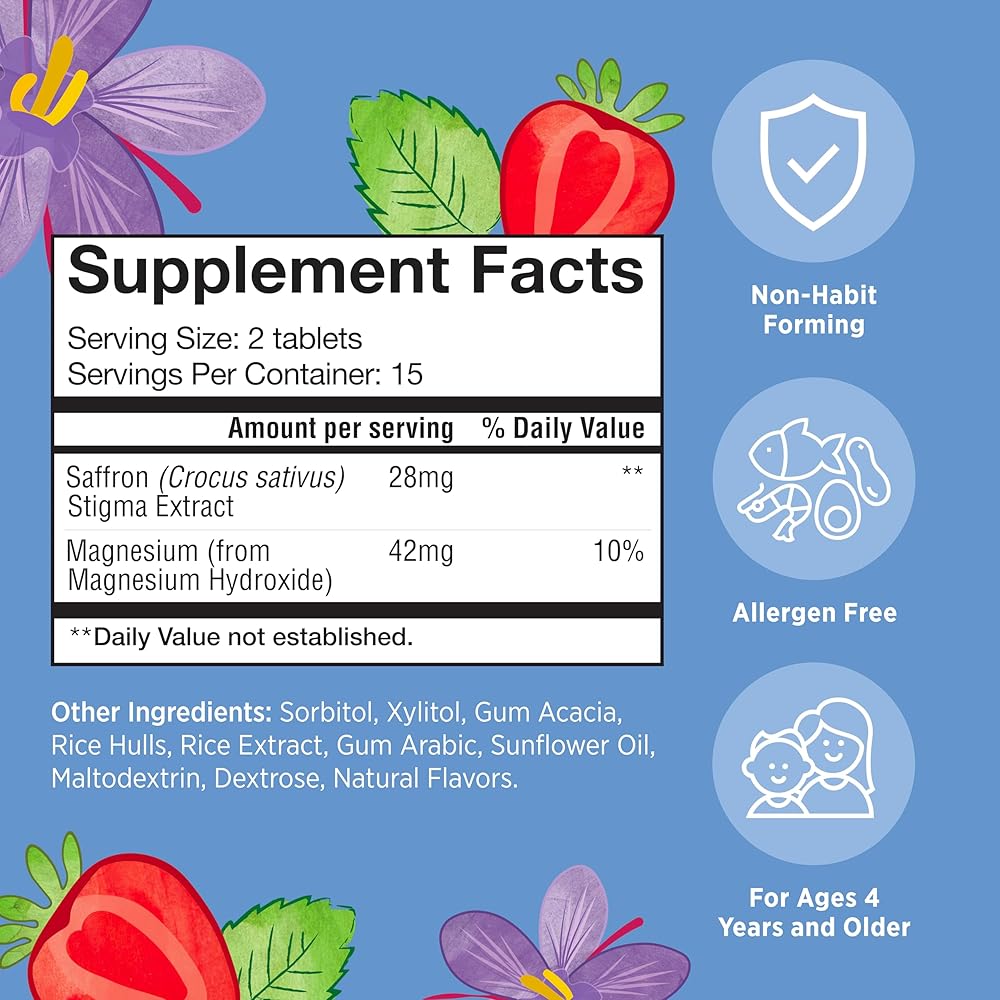Matys Kids Relaxation Support Chewable Tablets for Ages 4 Years +, Magnesium & Saffron Helps Calm Active Mind & Body to Unwind & Chill, Clean Alternative Made with Saffron & Magnesium, 30 Count