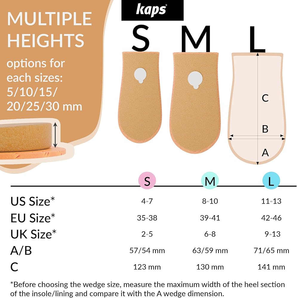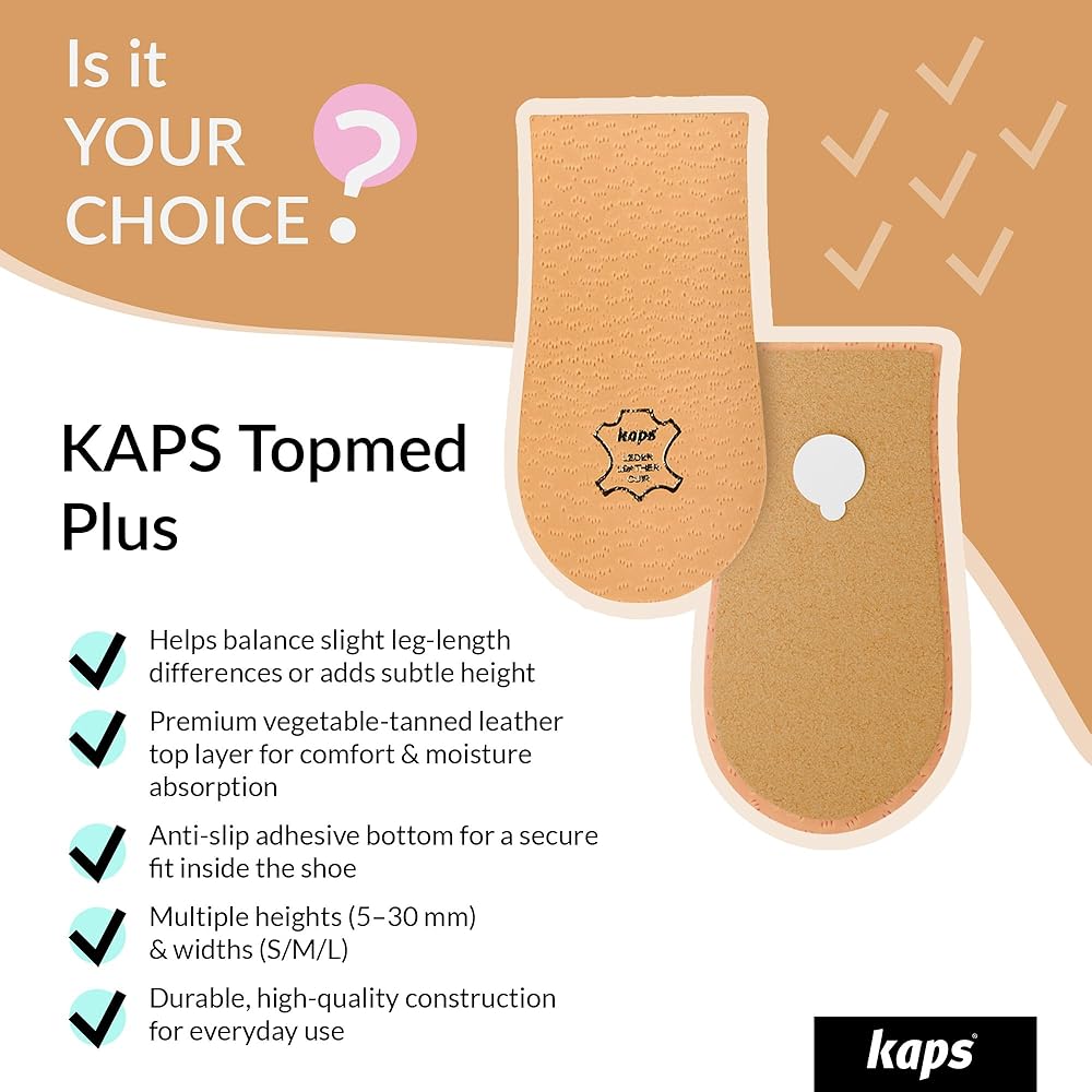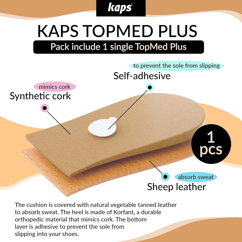 VARIOUS SIZES: Kaps Topmed Plus comes in different heights – from 5mm to 30mm – and different widths S / M / L. See product picture for complete sizing diagram. 1 pack contains 1 pad that can be put to either left or right shoe.