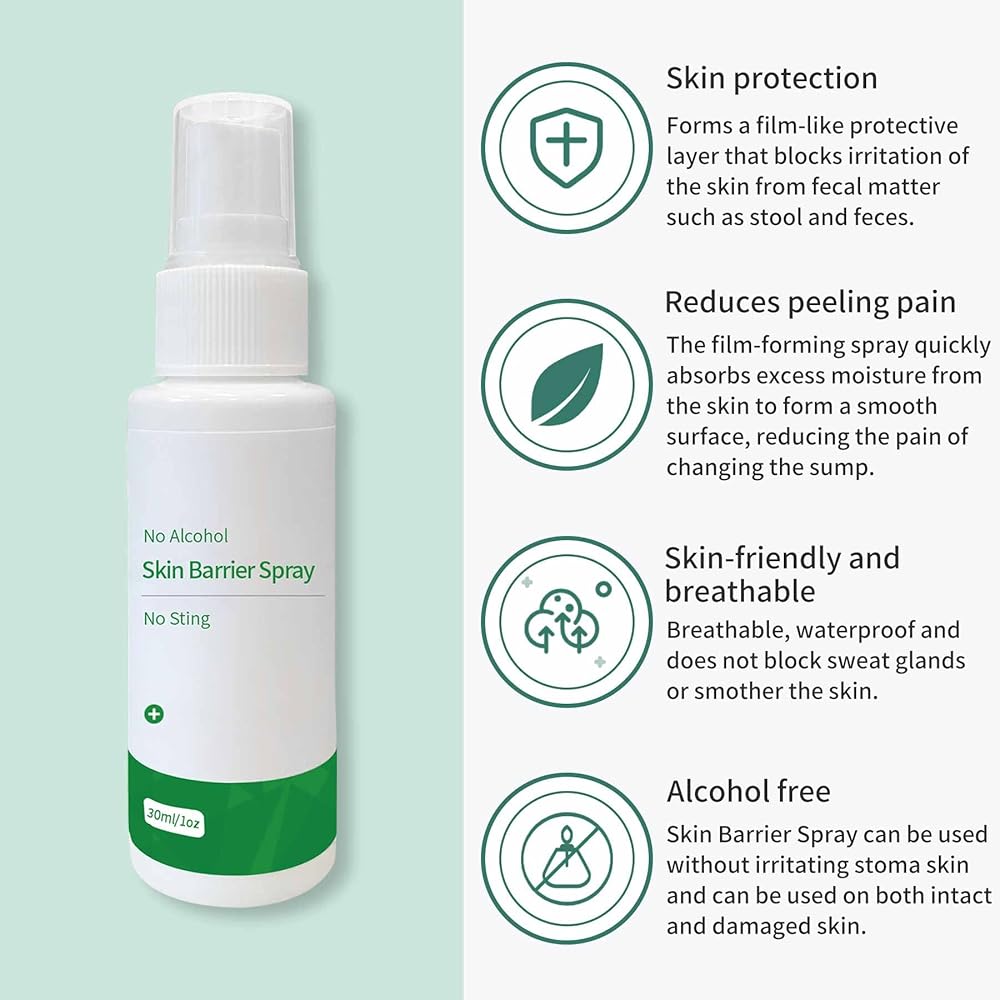 Skin Adhesive Barrier: This handy little skin prep spray leaves a protective barrier on your skin, which helps to reduce the damage caused by the repetitive removal of adhesives, it's especially recommended for use with other ostomy products.