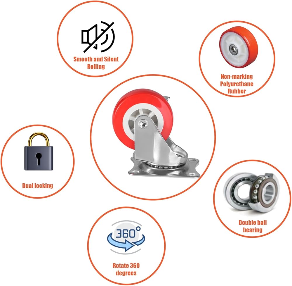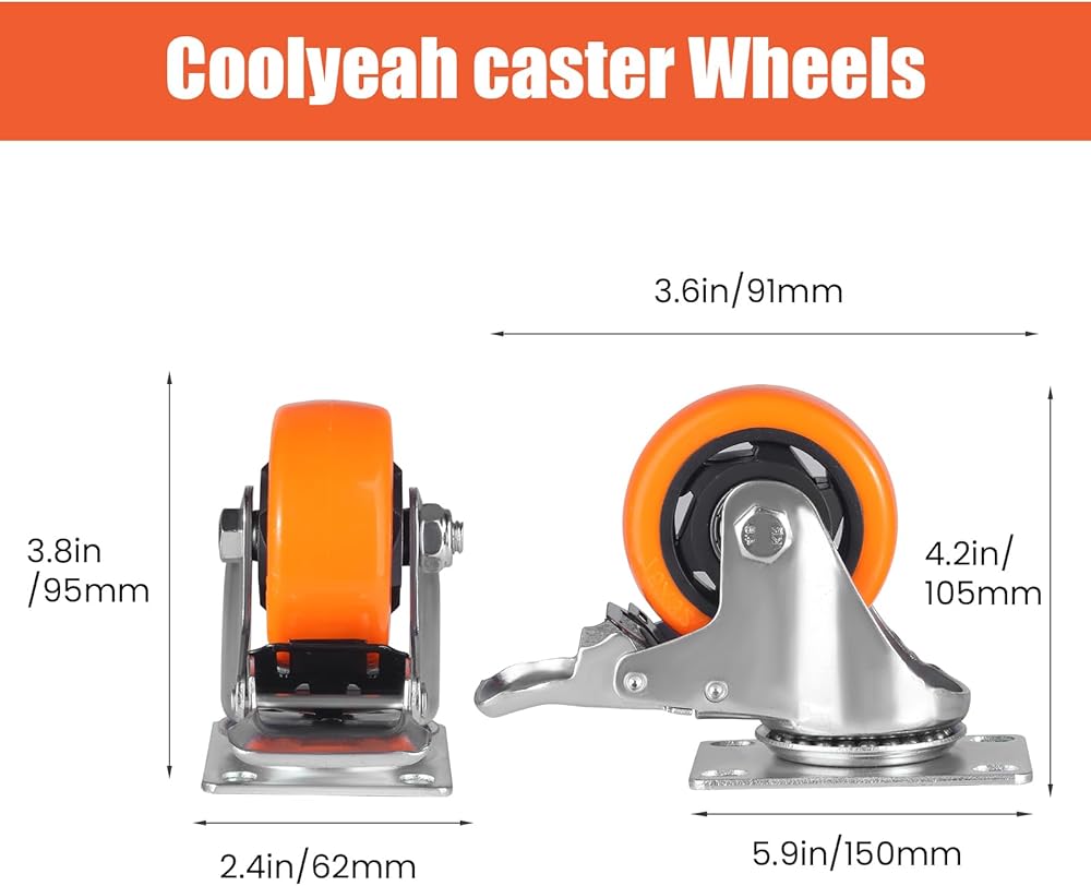 3-inch Medium-Sized Rotating casters, Set of 4, Suitable for Furniture Weighing Less Than 800 pounds workbenches, with a 360 Degree top Plate Lockable Heavy-Duty Orange PVC Roller