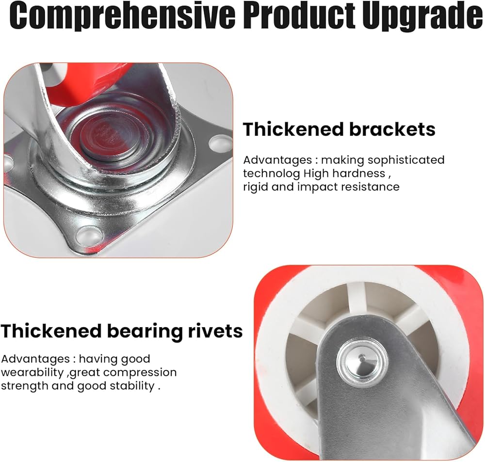 2.All 4 casters are designed to rotate 360 degrees and can be easily moved in any direction after installation. The dual bearing structure ensures smooth and quiet rolling of the rotating casters.