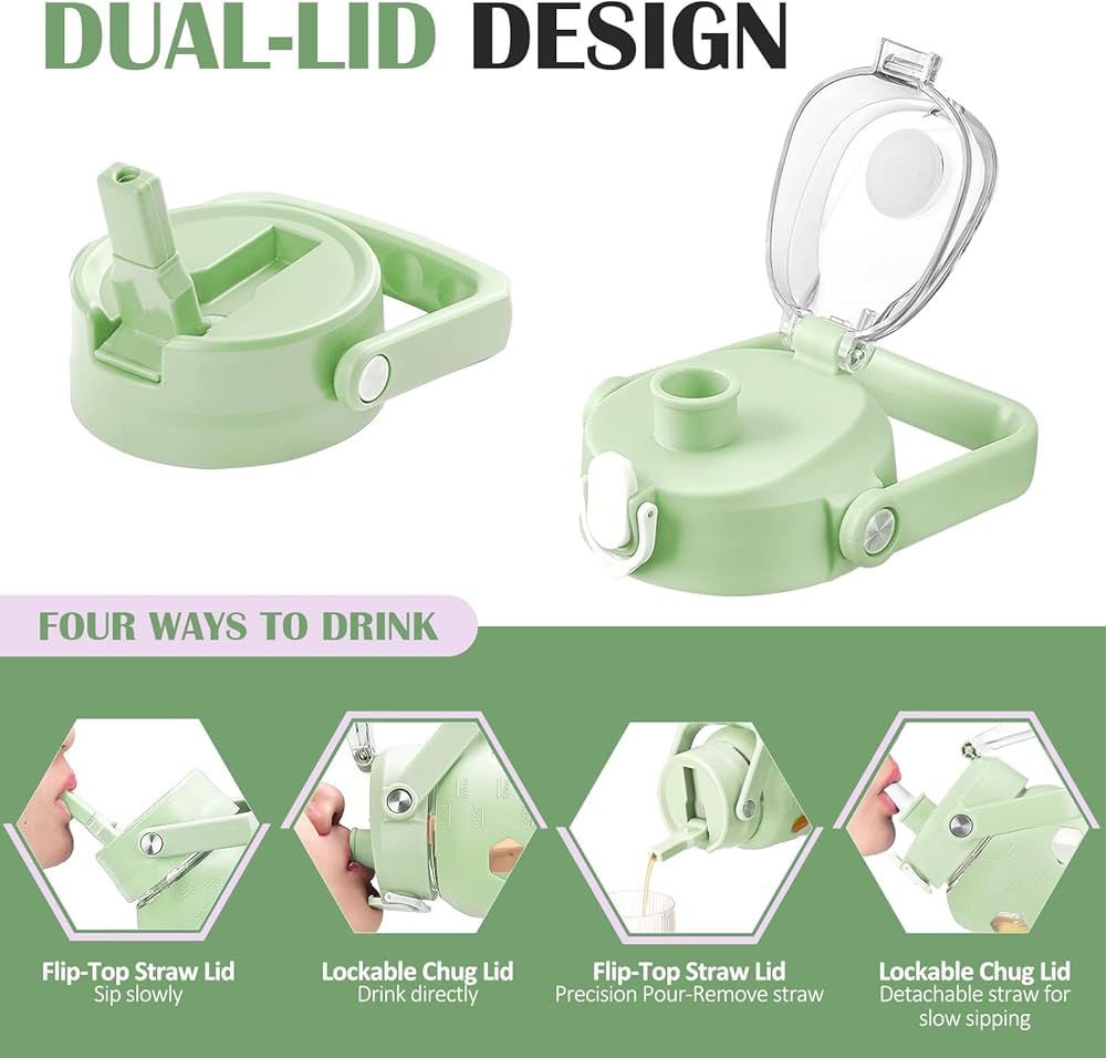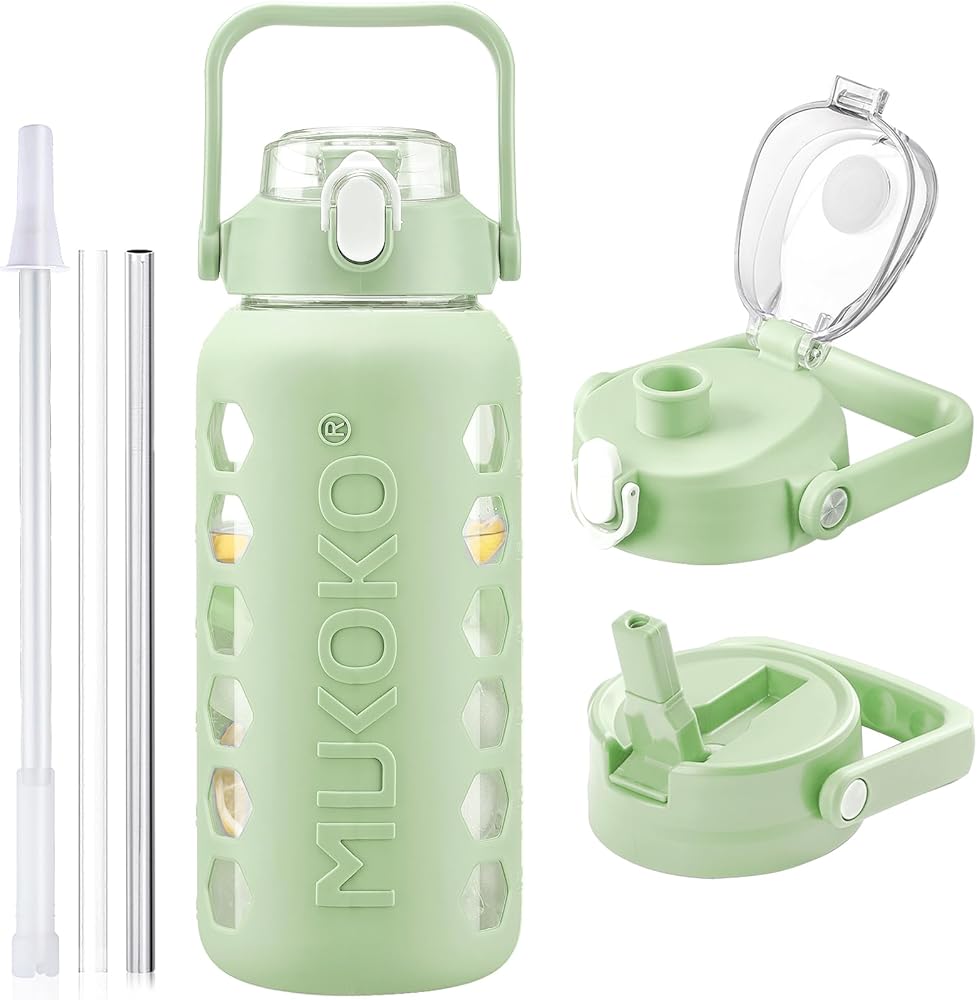 Unique Dual-Lid Design - MUKOKO 64 oz glass water bottle boasts a unique dual-lid design. It includes a flip-top straw lid, ideal for leisurely sipping, and a lockable chug lid for swift hydration. Innovative built-in straw system, fully enclosed for practicality and leak prevention.
