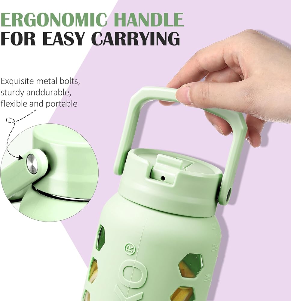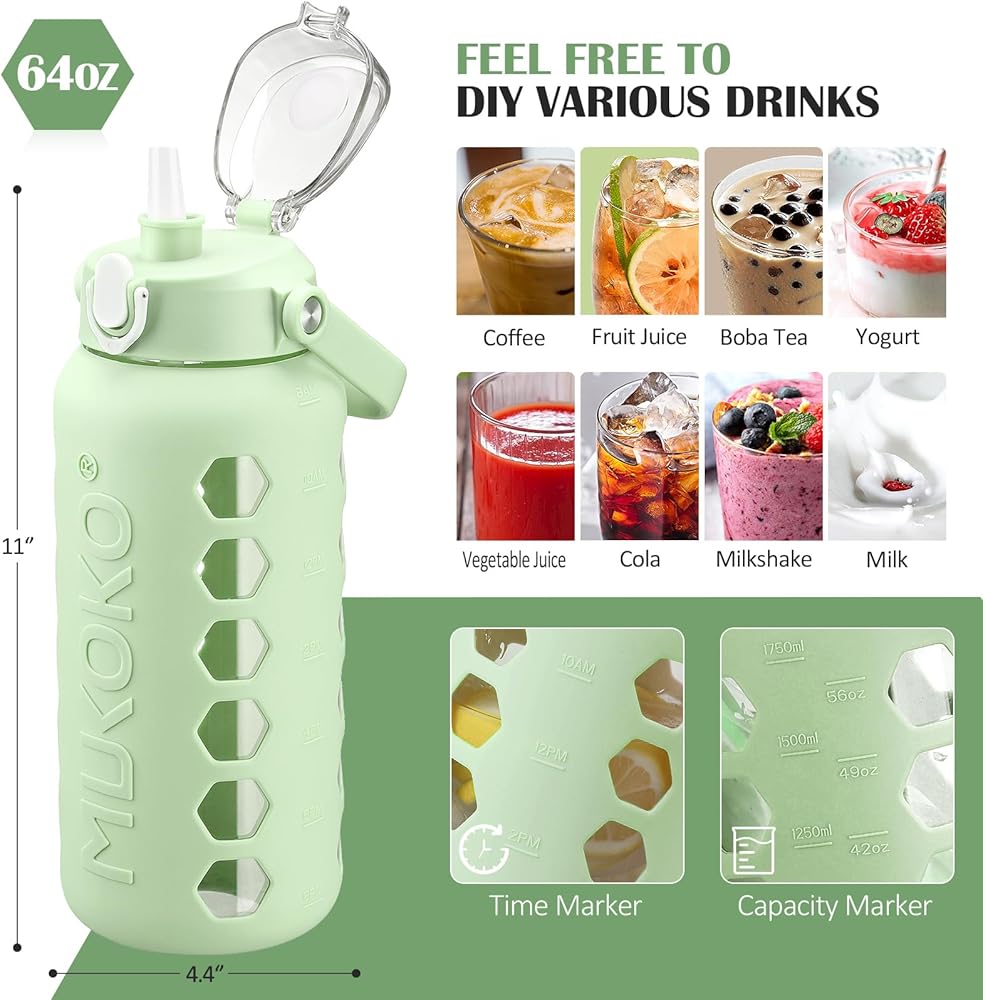 MUKOKO Glass Water Bottle 64oz with 2 Lids, Half Gallon Drinking Bottle with Straws and Measurements, 2L Sports Hydrate Jug with Silicone Sleeve, Leakproof, Green