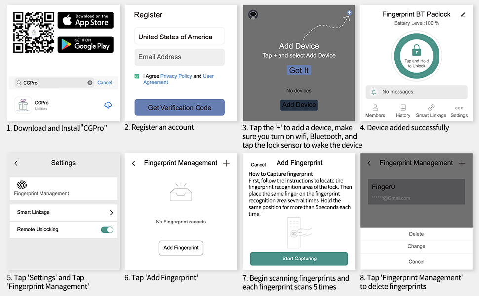 [Fingerprint and APP Functions] Connect the fingerprint lock via Bluetooth to our free app. The app can manage fingerprints, unlock, set authorized users, check unlock history, and more.