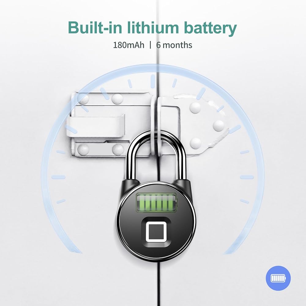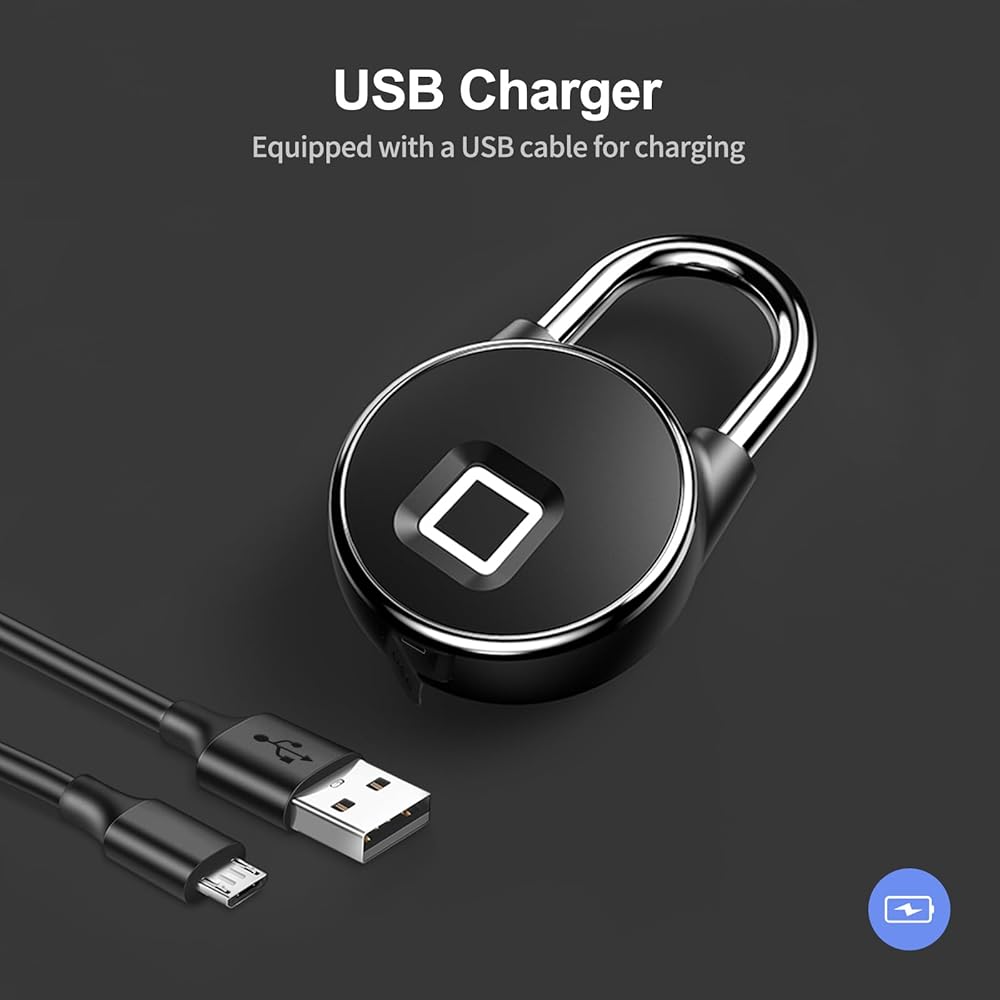 [USB Charger] The smart padlock is equipped with a USB cable for charging. (Please fully charge the device for first time use). When the battery is low, it will flash red.