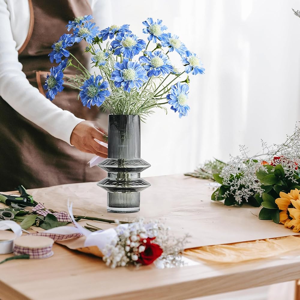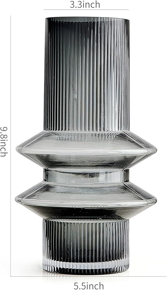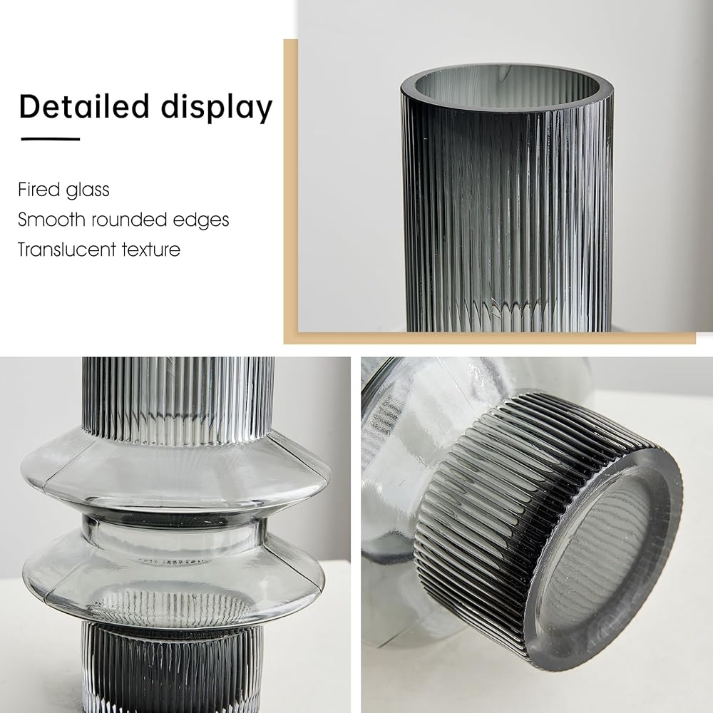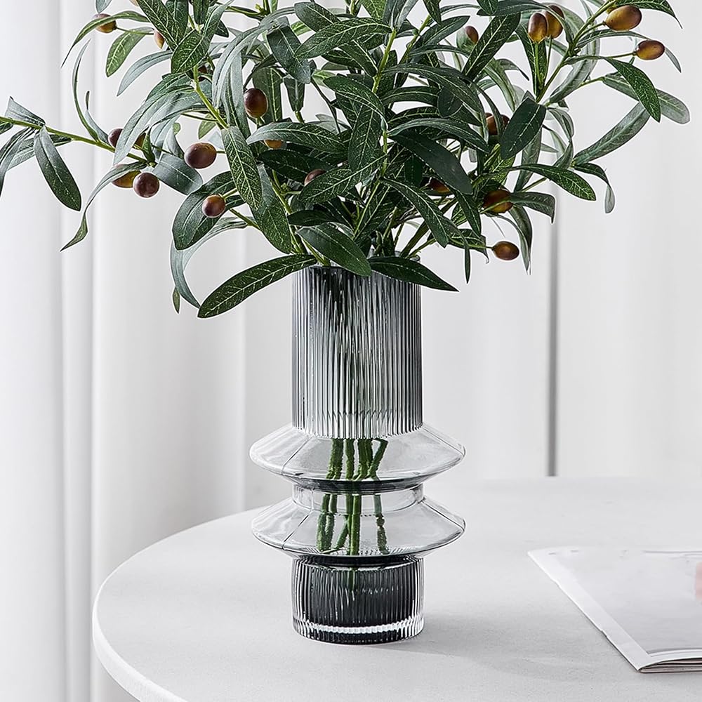 Octdays Grey Glass Vase Decor: Modern Large Glass Vase for Flower Ribbed Vases Tall Decorative Vase for Home Decor Living Room Centerpiece Table Wedding Office Decoration