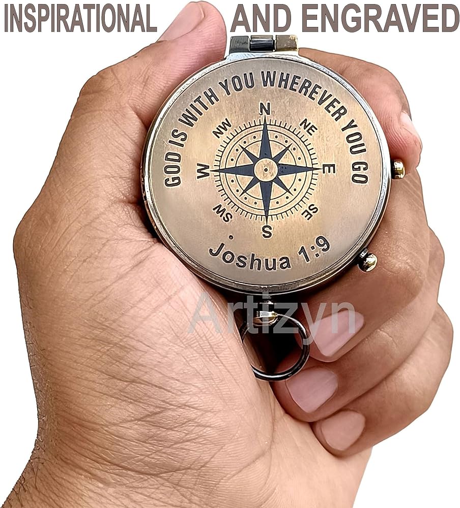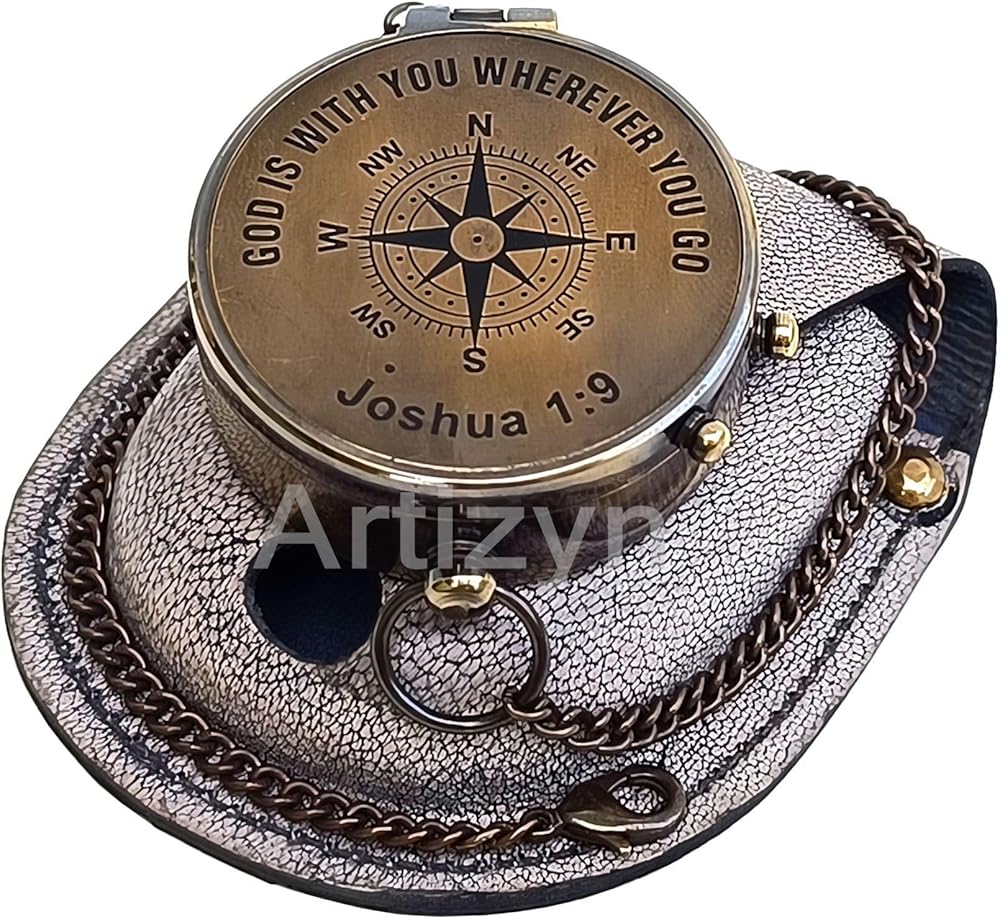 GOD is with You Wherever You GO Joshua 1:9 Engraved Compass with ‎Leather Case, Brass Camping Compass, Gift Compass, Graduation Day Gift for Son, Father, Love, Sister, Husband, Wife, Fiancé, Fiancée.