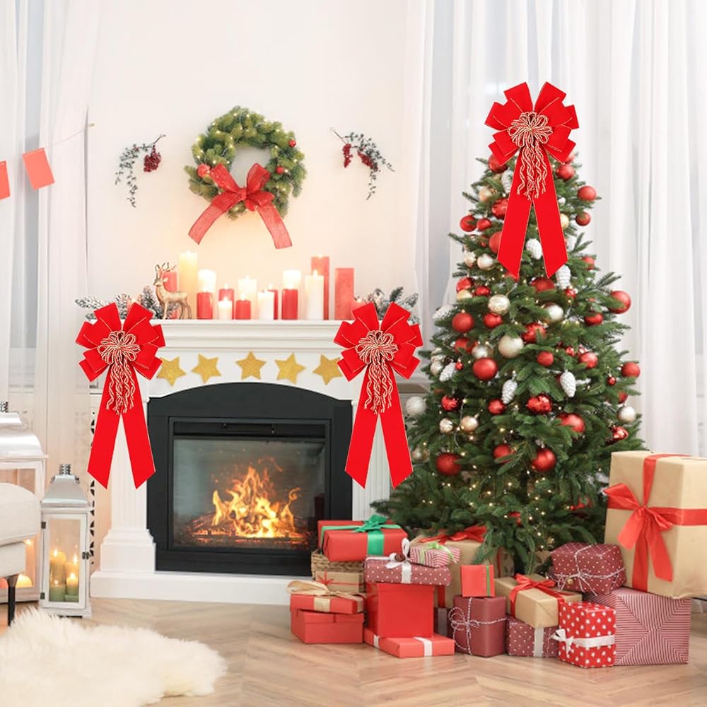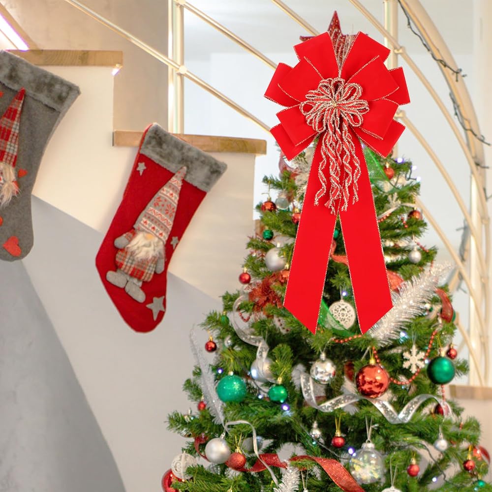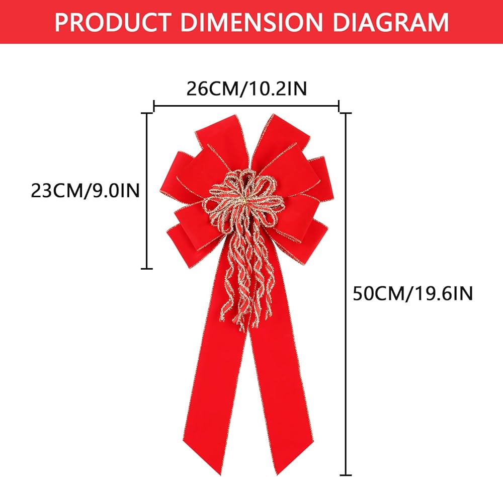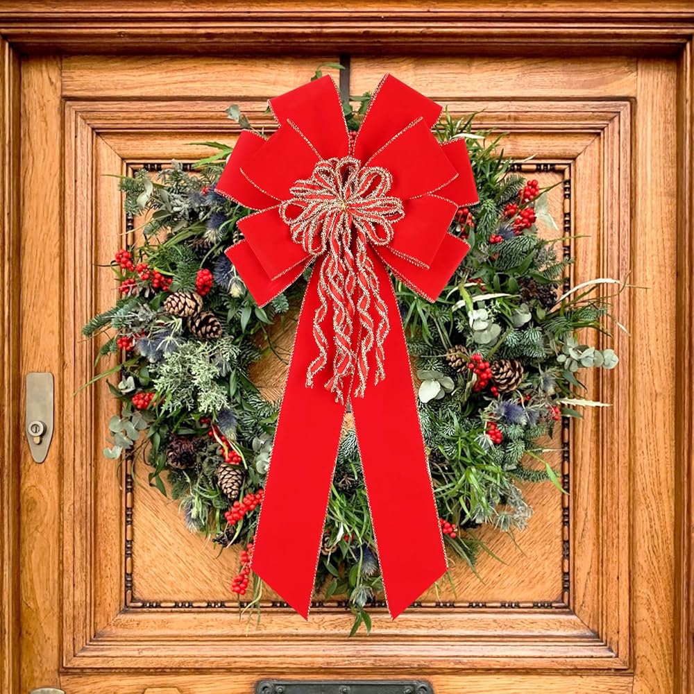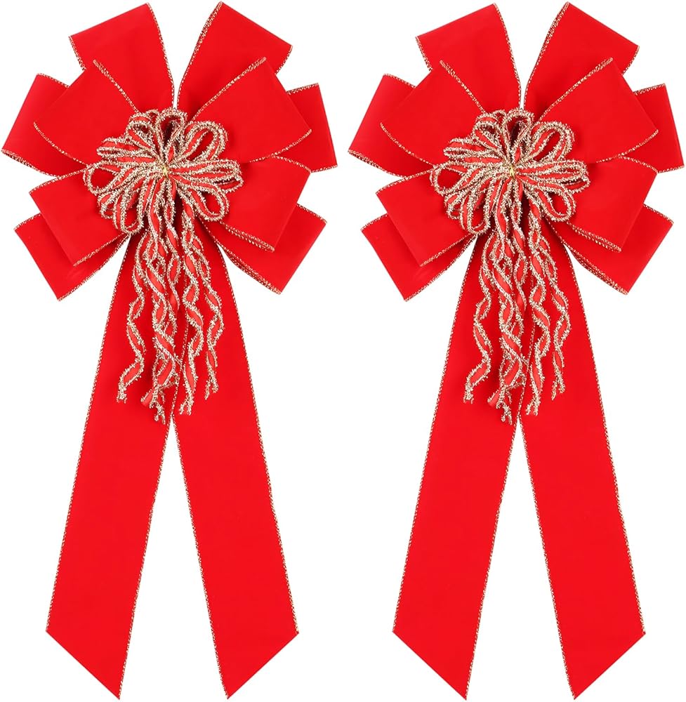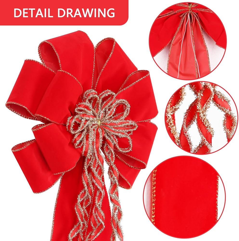 Super Holiday 2 Pack Red Christmas Bows, 20"x10.5" Large Velvet Christmas Tree Topper Ornaments for Xmas Tree Decorations, for Home Front Door Wreath Bow Indoor Outdoor Party Valentine's Day Decor.
