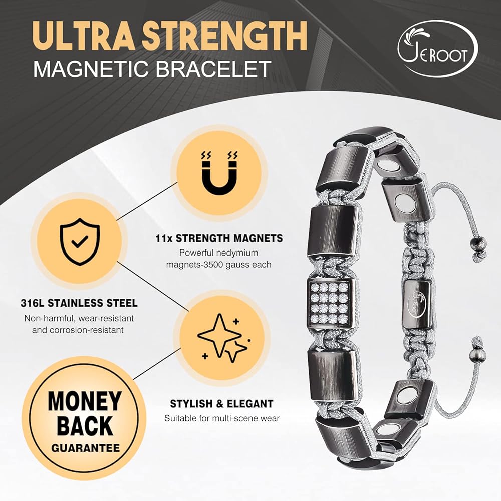 TITANIUM STEEL MAGNETIC BRACELET---This male flat beaded bracelet is woven from 316 titanium steel and 10mm flat beads (embedded with super strong magnets). This magnetic bracelet for men has a total of 11 magnets, each of which is 3500 gauss, dedicated to maximizing its magnetic effect. it is a unique piece of art that you can wear for years to come.