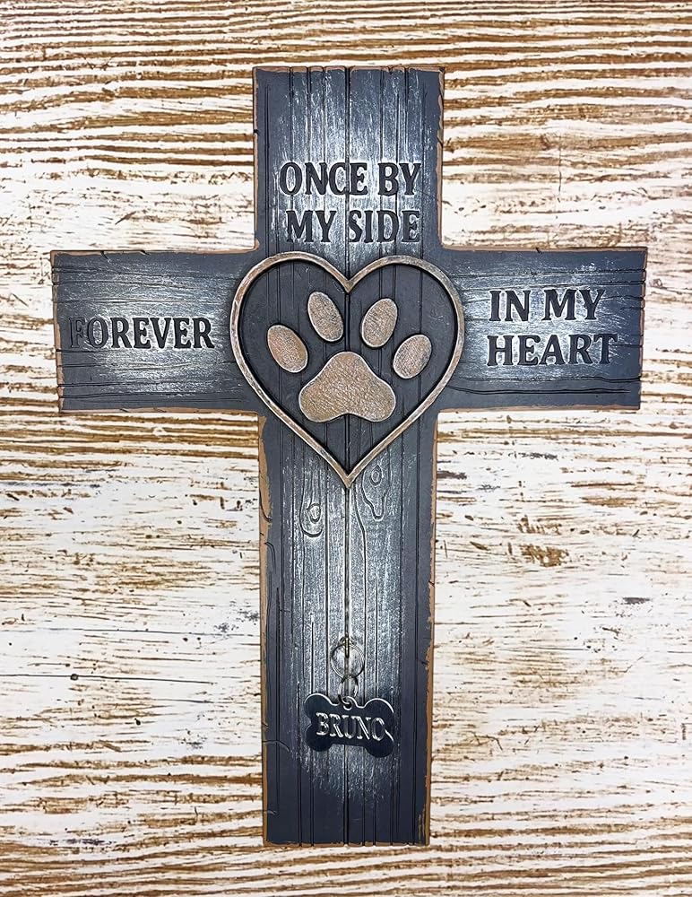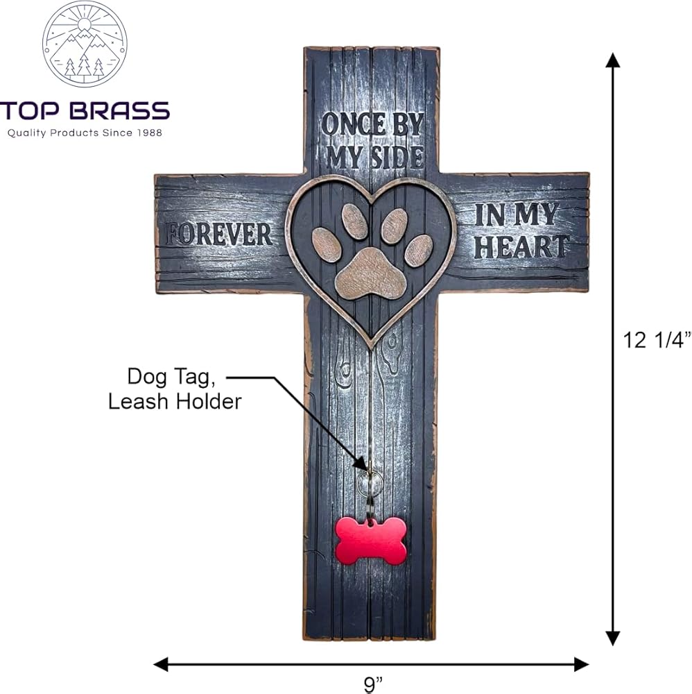 Top Brass Pet Memorial Wall Cross – Paw Print & Heart with Name/Rabies Tag, Collar Hook – Once by My Side Forever in My Heart – Loss of Dog/Cat Sympathy Decor