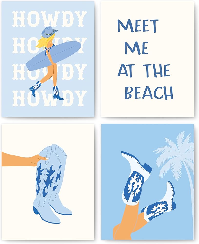 okaxscm Coastal Cowgirl Room Decor Aesthetic, Wall Art Prints Set of 4, Granddaughter Room Decor, Blue Preppy Beach Surf Poster for Teen Girls Bedroom Dorm, 8x10 Unframed