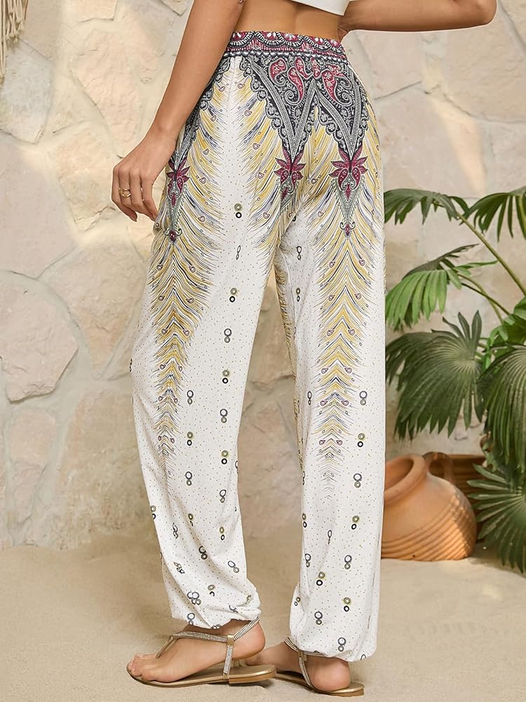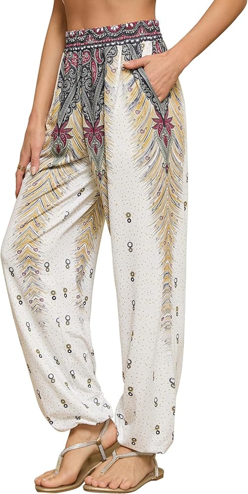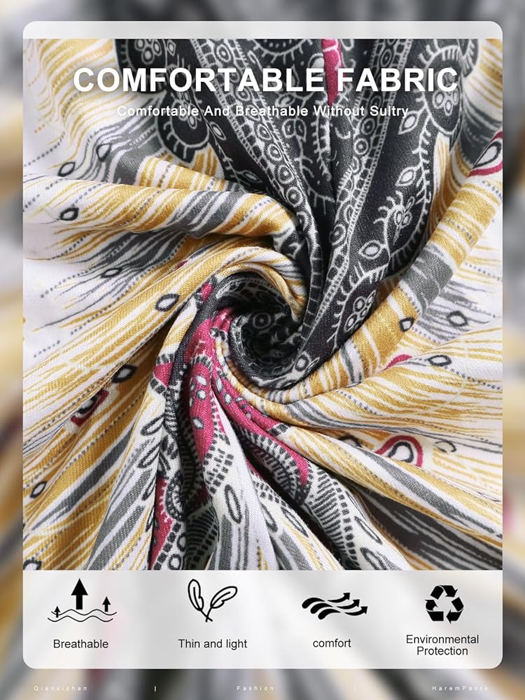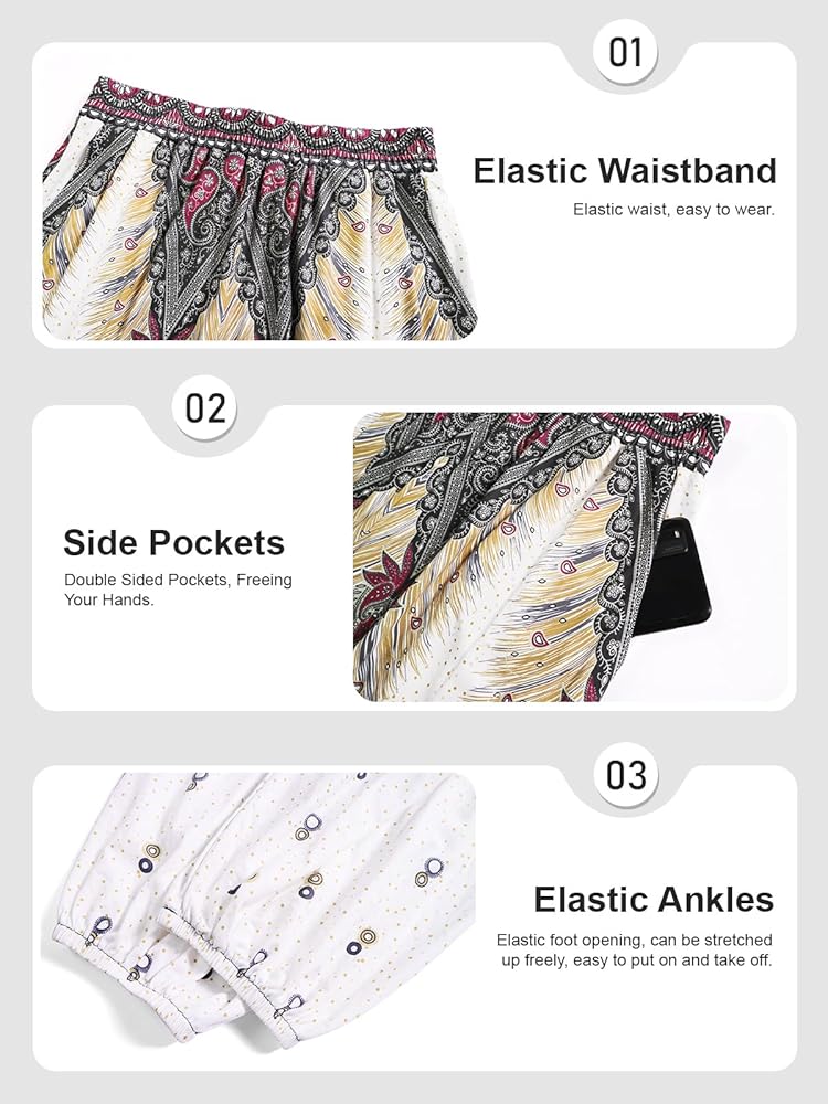 👖Features: Women harem pants boho palazzo hippie floral yoga trouser, Elastic waist and ankle.2 large side pockets Loose style boho pants fit for many shapes. Simple and classic style .