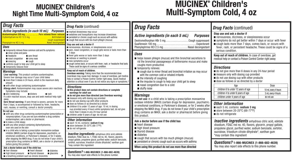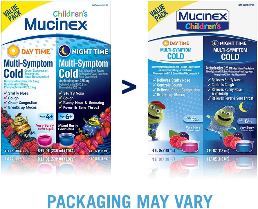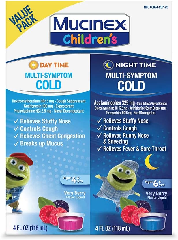 The day time liquid breaks up mucus, controls cough and clear stuffy nose, the night time liquid cold medicine relieves fever, sore throat, runny nose, sneezing and controls cough.