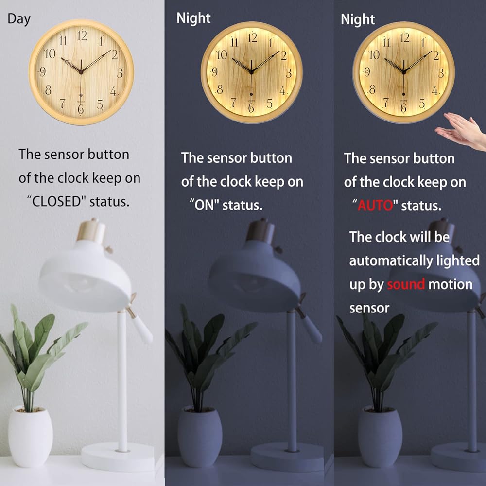 【Smart Automatic Night Light】The glow in the dark wall clock is equipped with a high quality smart light sensor, The clock will be automatically lighted up by sound motion sensor. But the surrounding environment needs to be dark and the sensor button of the clock keep on “AUTO" status.