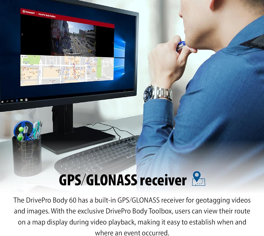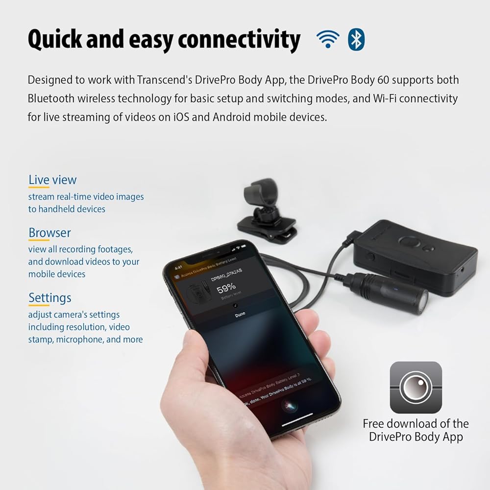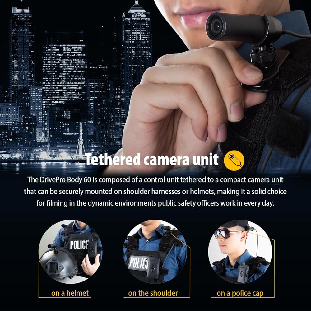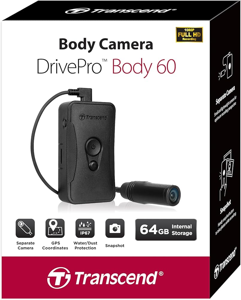 Transcend's DrivePro Body 60 body camera features a compact camera unit tethered to a control unit, allowing for a wide variety of attachment options. Tailor-made for public safety professionals, the rugged and highly responsive DrivePro Body 60 allows high-definition evidence collection and wireless data previews and transfers.