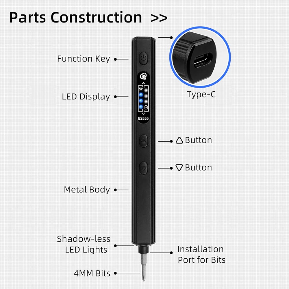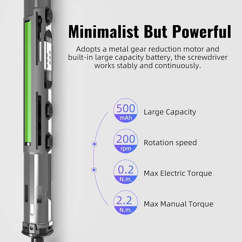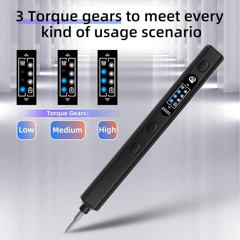 Powerful Screwdriver Set - This cordless screwdriver has 3 torque settings. The electric torque is up to 0.2N.m, and the manual torque up to 2.2N.m. High rotation speed of 200rpm. Built-in 500mAh rechargeable battery, ES555 can work 4H continuously after fully charged.