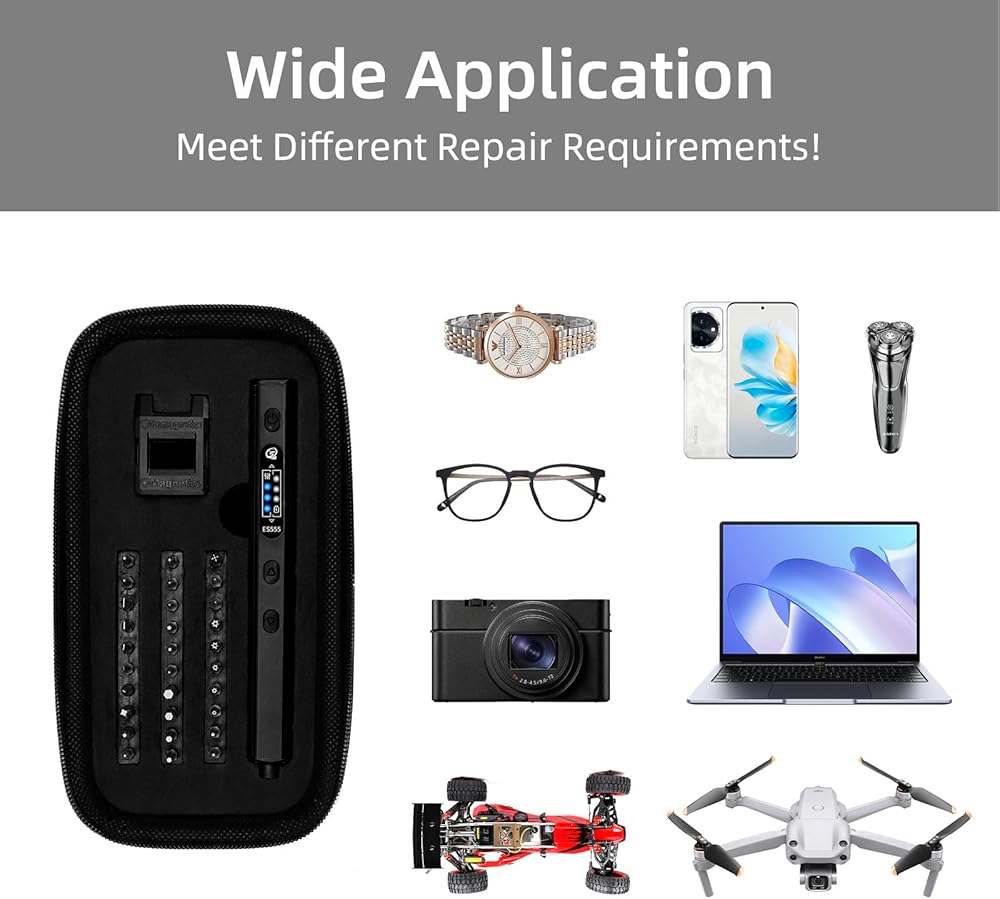 30-in-1 Precision Screwdriver Set - ES555 comes with 30pcs S2 steel magnetic bits, which meets your most daily repair & maintenance needs. Suitable for FPV racing drones, mobile phones, laptops, game consoles, cameras, watches, glasses, etc.