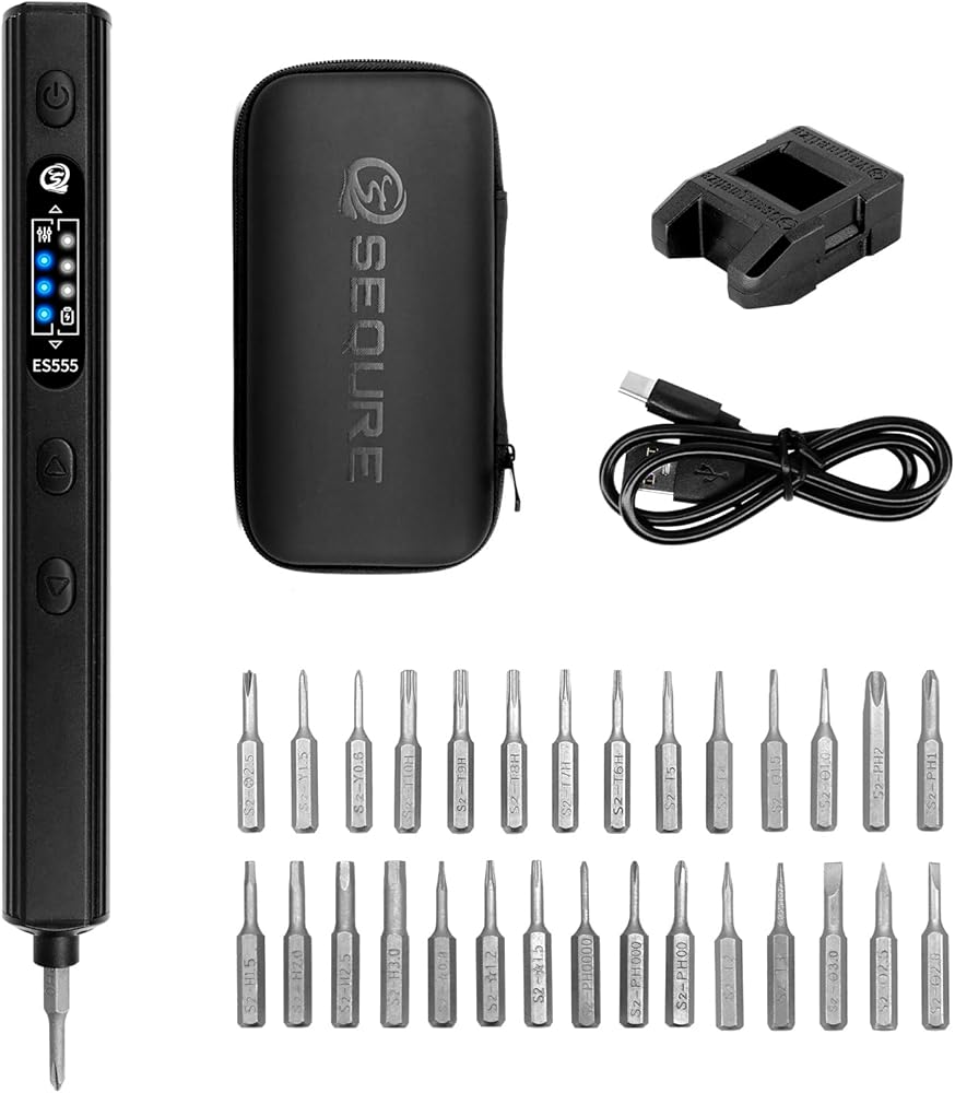 SEQURE ES555 Electric Screwdriver Set, 5V Cordless Screwdriver Rechargeable, Auto & Fixed Mode, 30-in-1 Magnetic Driver Bits, 3 Torque Settings, LED Lights, Repair Tool for RC Drones Electronics PC