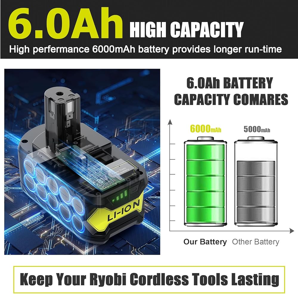 🔋【Battery Features 】Battery Voltage: 18V | Battery Capacity: 6000mAh | Wattage: 108Wh | Battery Type: Rechargeable Lithium-ion | Made with high quality Li-ion cells. Compatible with ryobi 18V cordless tools.