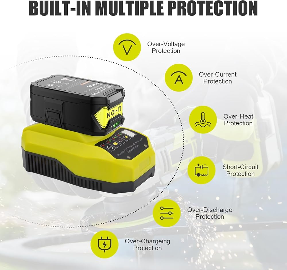 🔋 【Multiple Protection 】The battery replacement for ryobi 18v is multi-certified, tested, and validated by manufacturers to match the specifications of OEM products. Built-in High-quality cells that can protect against overcharge, over-discharge, over-current, over-voltage, and short circuit.