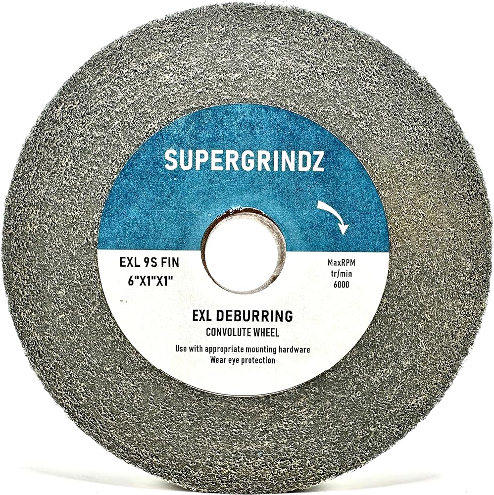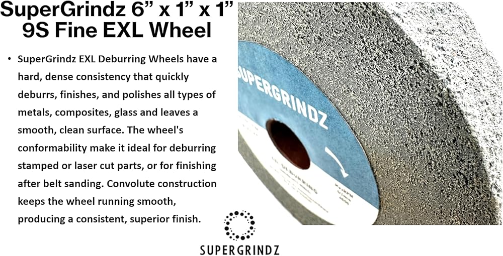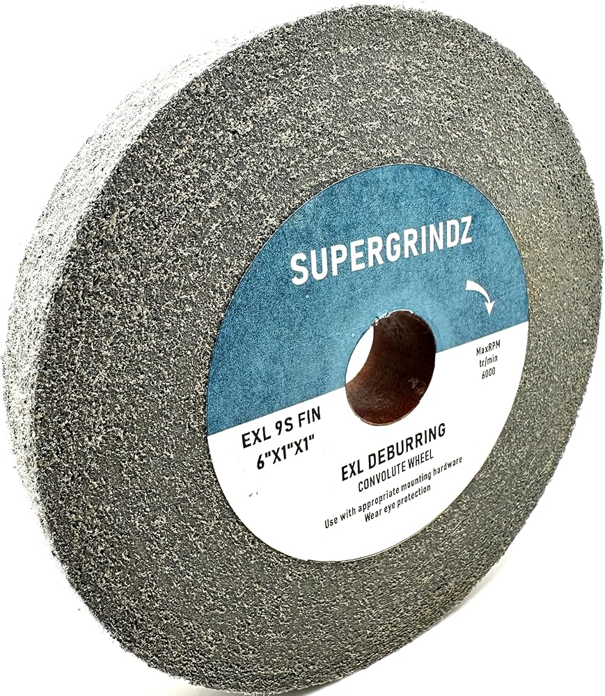 SuperGrindz EXL Deburring Wheels have a hard, dense consistency that quickly deburrs, finishes, and polishes all types of metals, composites, glass and leaves a smooth, clean surface. The wheel's conformability make it ideal for deburring stamped or laser cut parts, or for finishing after belt sanding. Convolute construction keeps the wheel running smooth, producing a consistent, superior finish. EXL Deburring Wheels are an industry standard for deburring and finishing applications. EXL Deburring Wheels produce a clean surface without smearing, reducing the need for additional clean up and preparation. The wheel's convolute construction allow for even and uniform wear, keeping the wheel running smoothly, and help the operator attain a professional finish while minimizing the pressure required on the workpiece. The EXL Deburring Wheel's nonwoven material runs cool. As the wheel wears, fresh abrasives are continuously exposed, making it a superior choice on heat-sensitive substrates. The toughness and durability of the wheel extends its service life. Mineral Type: Silicon Carbide Color: Gray Form Type: Convolute Wheel Max RPM: 6,000 Density: 9 (9SFIN) Grade: FINE Diameter: 6" - 152.4mm Width: 1" - 25.4 mm Center Hole Diameter: 1" - 25.4 mm