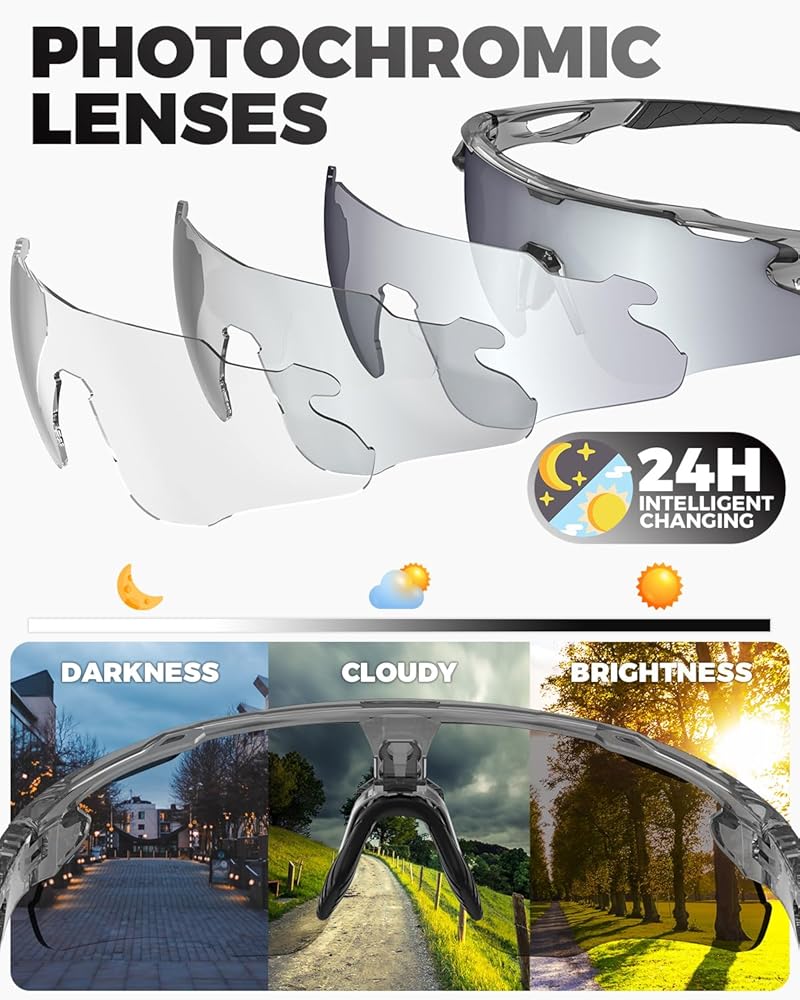 Built-in Myopia Frame: Our photochromic sunglasses for men come with a myopia frame, which can be stuck in the frame near the nose clip. No installation tools are needed. You can enjoy cycling or outdoor activities even if you are myopia.