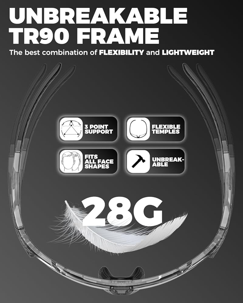 Excellent Wearing Comfort: The mountain bike glasses with TR90 frame is super light only 30g, which equipped with adjustable nose pad and non-slip rubber temples, provide you with more comfortable wearing experience.