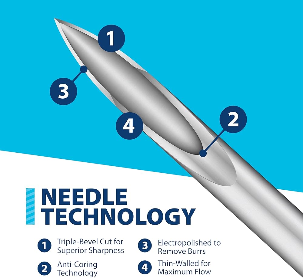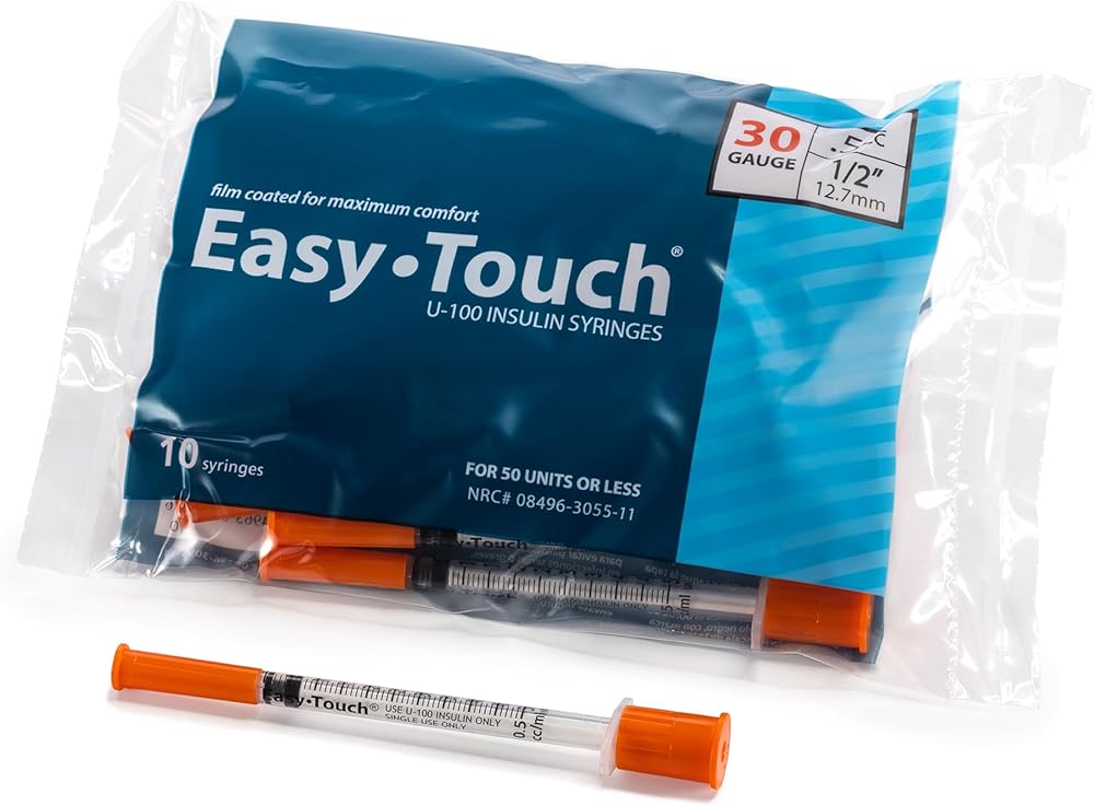 Sharp Needle Syringe For Comfortable Injection: EasyTouch diabetic needles are made with surgical steel, film-coated, tri-bevel cut, and electro-polished to remove burrs, creating one of the sharpest insulin needles on the market, per STR Labs