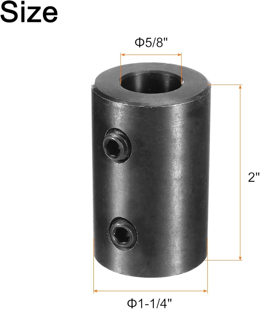 Size - 5/8 inch bore rigid set screw coupling, with 1-1/4 inch outside diameter, 2 inch length. (2 set screws)