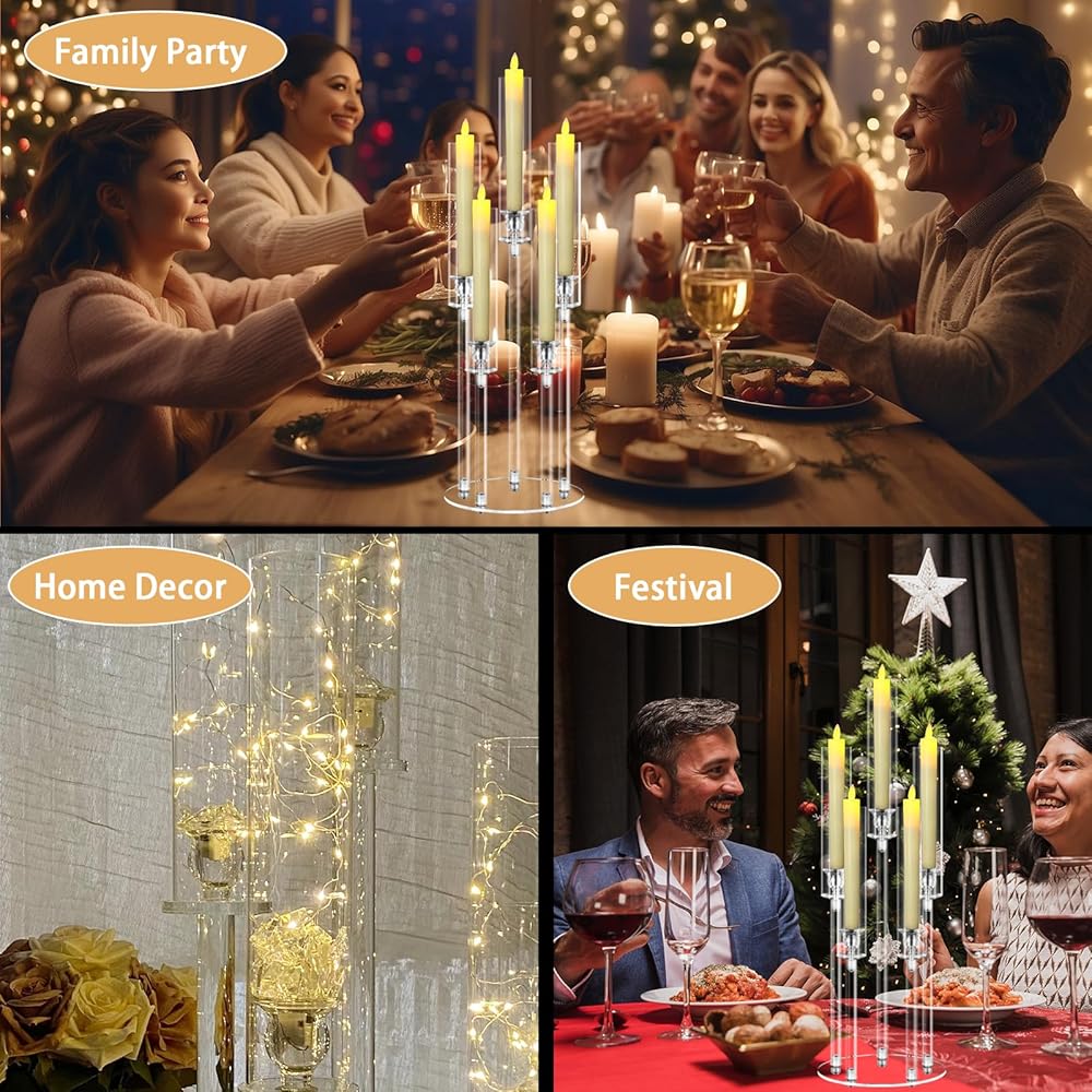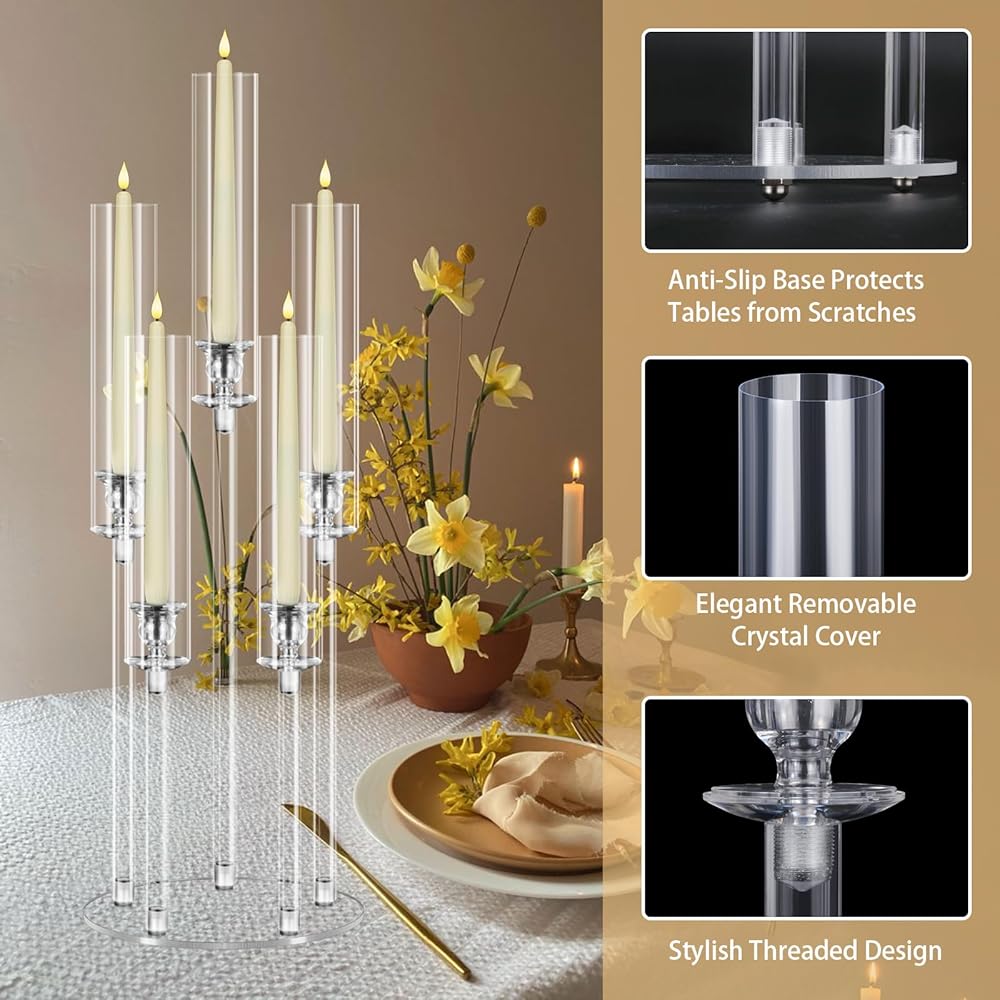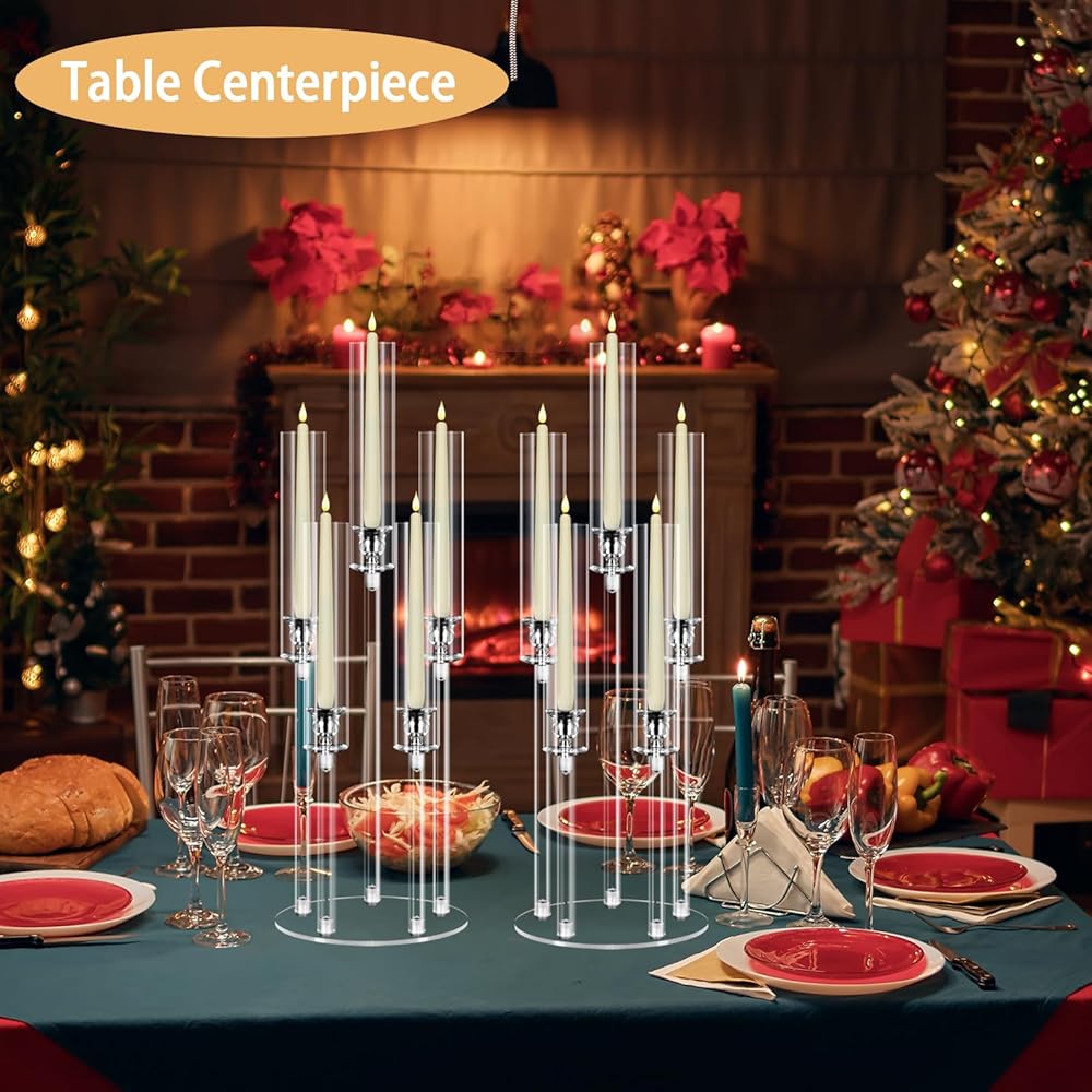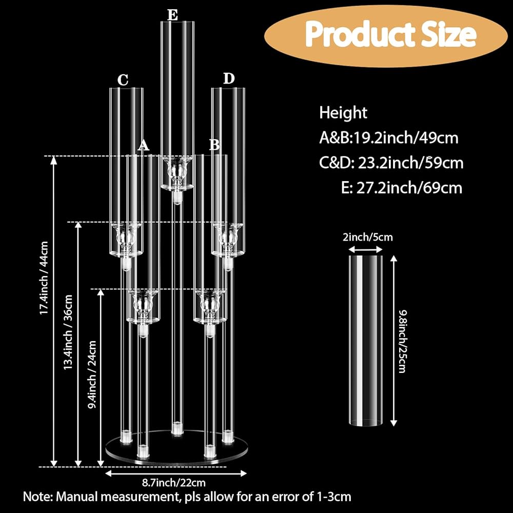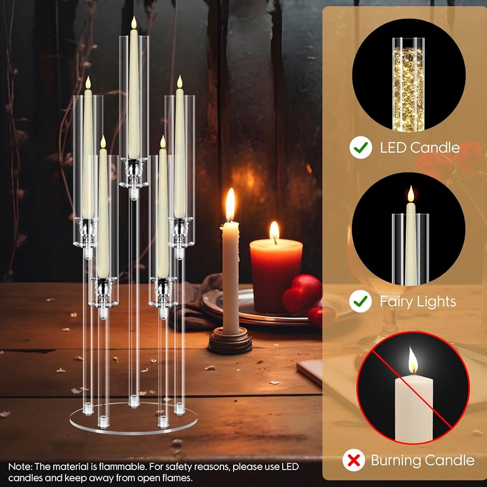 تتضمن العبوة: سوف تحصل على 4 قطع شمعدان أكريليك 5 أذرع مع أغطية مصابيح. الارتفاعات: 19.2 بوصة و23.2 بوصة و27.2 بوصة. قطر القاعدة: 8.7 بوصة. يناسب شموع LED مقاس 0.8 سم. (الشموع غير متضمنة؛ يرجى استخدام شموع LED.)
