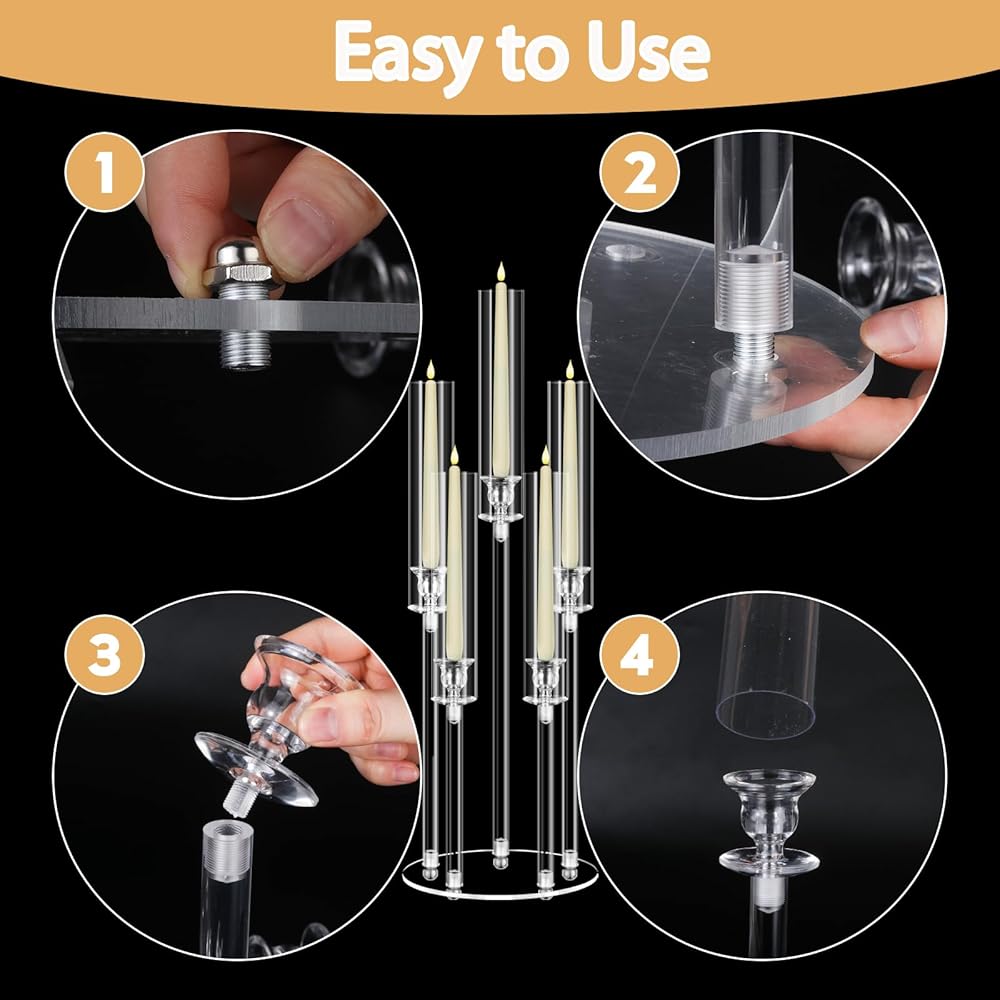 【سهل التركيب】يتميز الجسم الرئيسي والإكسسوارات لحامل الشموع الأكريليك بتصميم ملولب، مما يسمح بالتجميع السريع دون الحاجة إلى أدوات. ملحوظة: يرجى إزالة الغشاء الواقي قبل التثبيت.