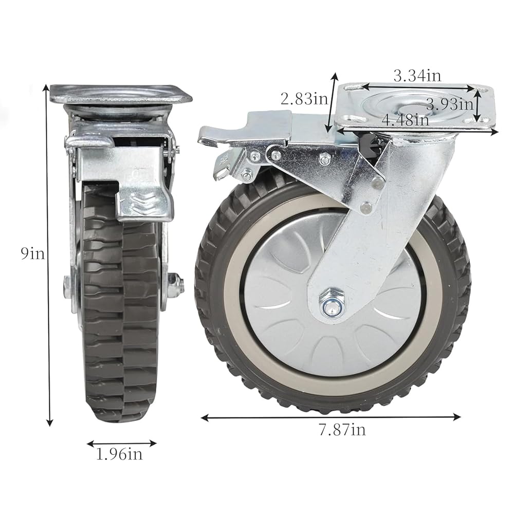 ⚙【Industrial 4 casters 】: 4 Wheels, diameter: 8 ", total height (from the top of the thread): 9", combined load capacity: 1764 lbs , Plate dimensions: 4 "x 4.5" x 0.24 ", 2 casters with brakes and 2 casters without brakes.