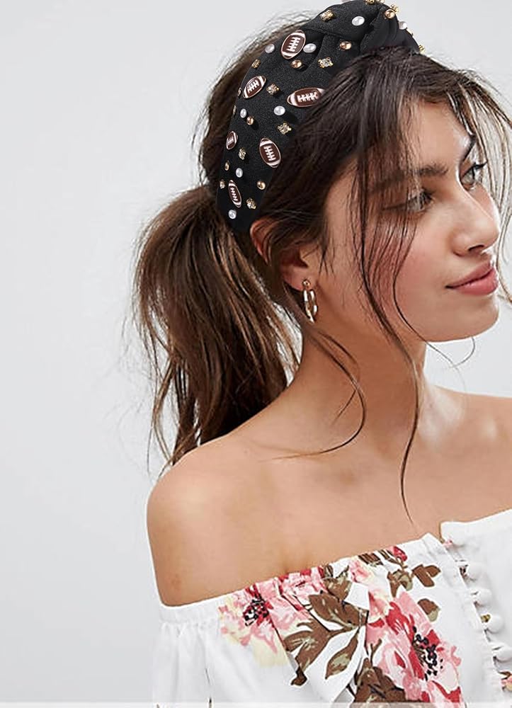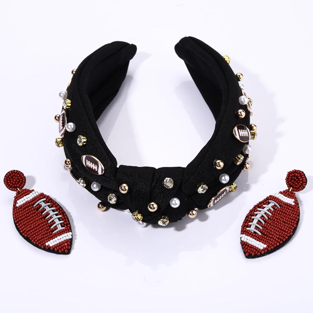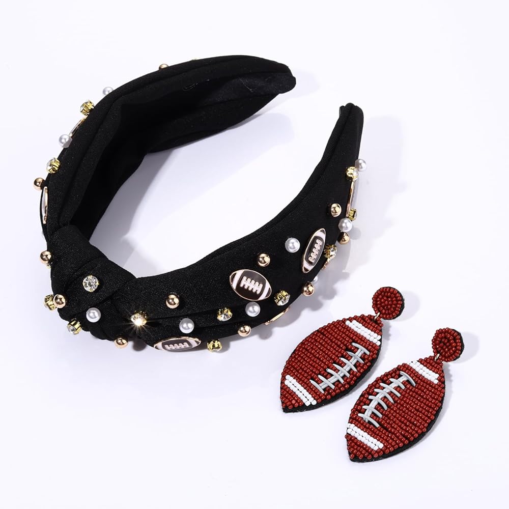 Football Knotted Headband :Want to show your team spirit without breaking the bank? Look no further than our Football Headband! This stylish headband features knot design adorned with rhinestones ,white pearls ,gold beads and football charm accents. Gear up for game day with this topknot pearl rhinestone jewel headband beaded football earrings ! Perfect for a day at the stadium, tailgate, or watch party!So you can always look fashionable and show off your loyalty during athletic events. Go team!