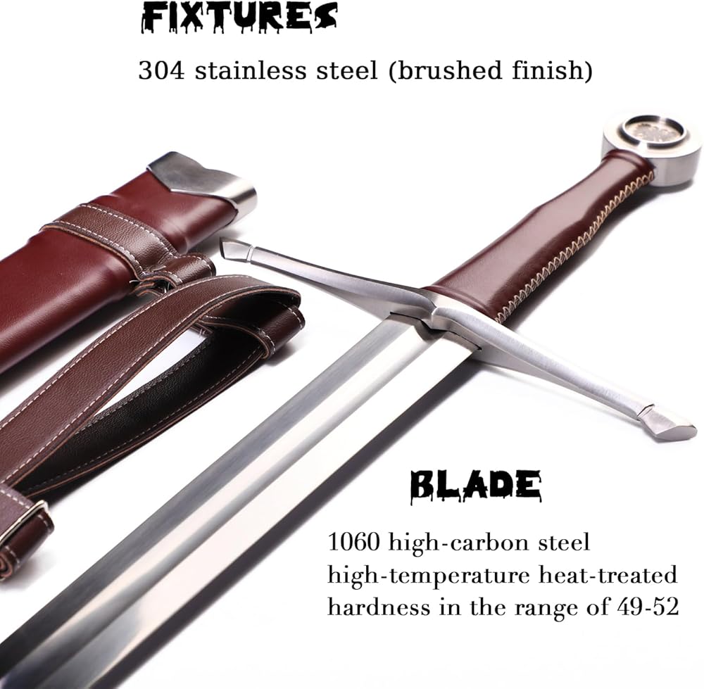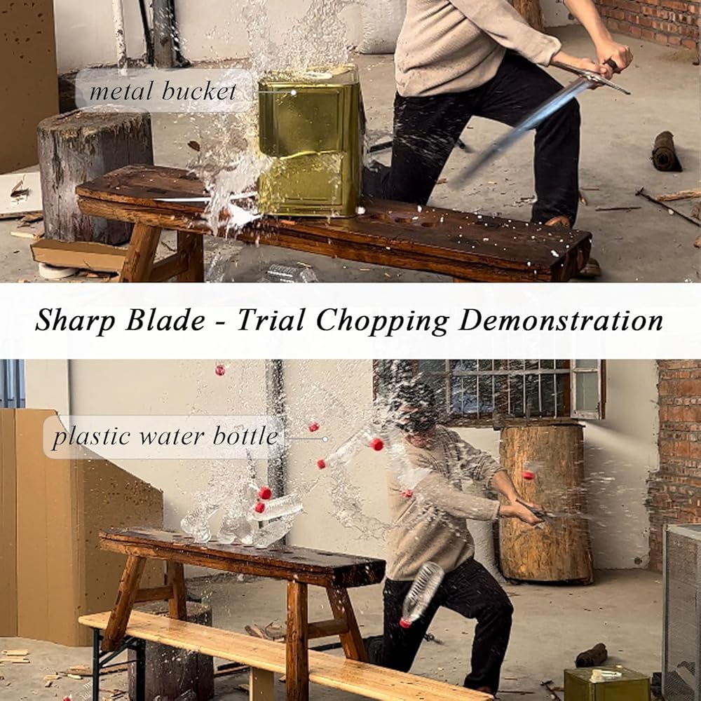 [Material] - ✅The blade is hand forged from a single piece of high carbon steel with a hardness of HRC 60. ✅The full tang blade is stable and can be wielded at will. ✅The handle is wrapped in leather for a comfortable, non-slip grip.