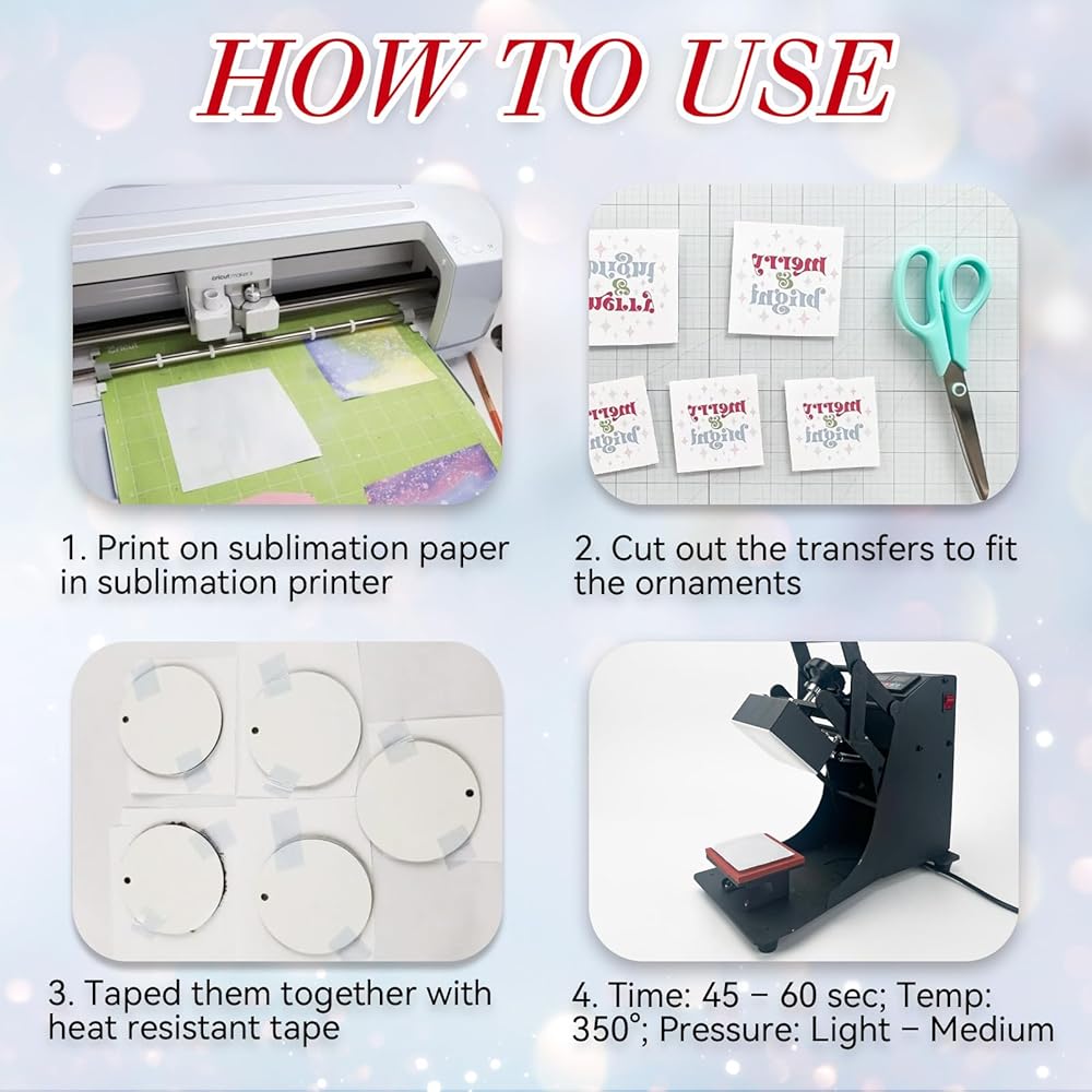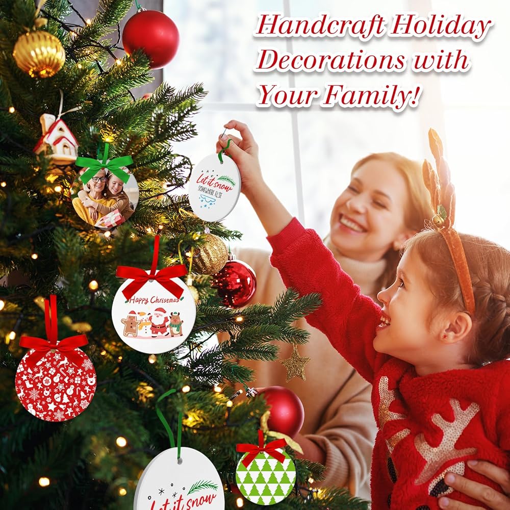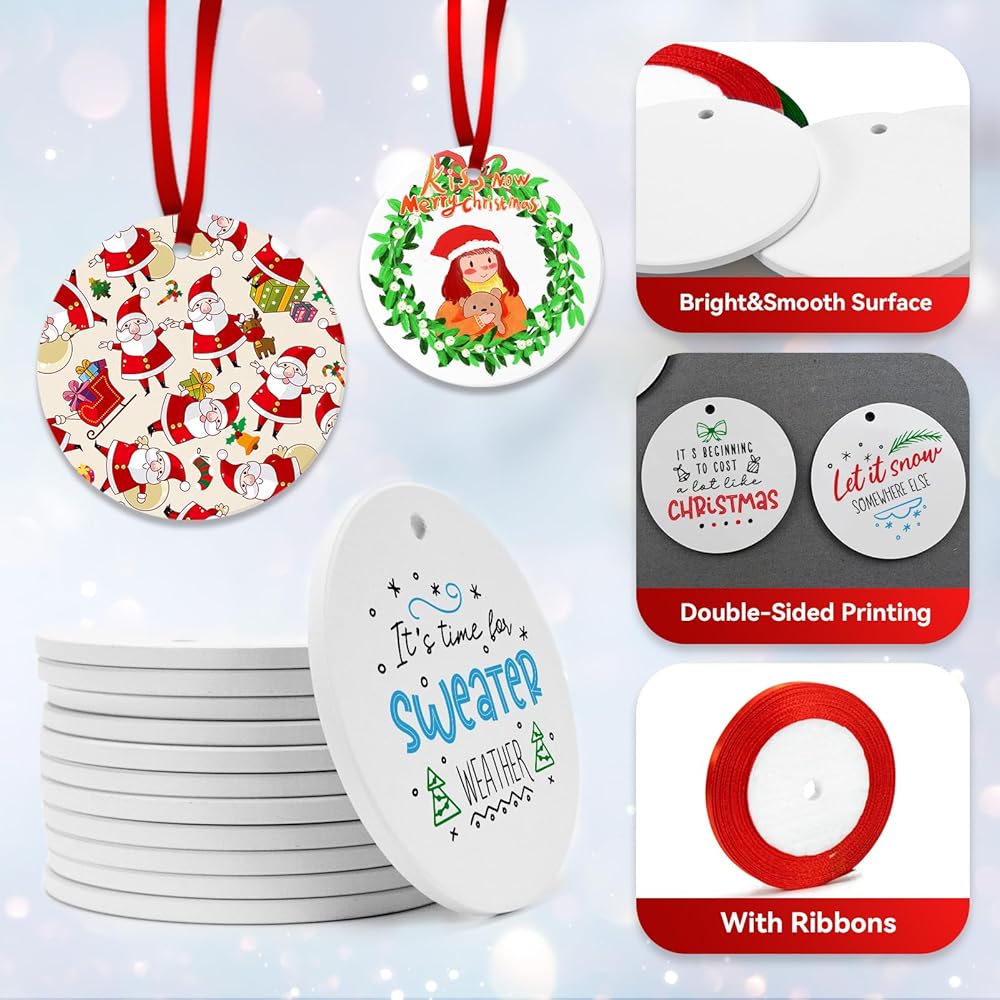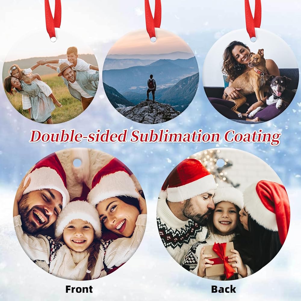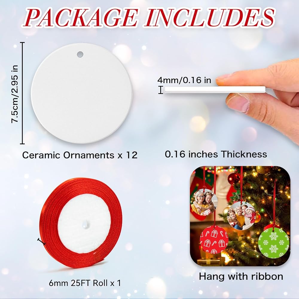 【Package Included】You will receive 12 PCS sublimation ceramic ornaments blanks in white and a rolls of Christmas satin ribbon. The Christmas ceramic ornament blank size is around 2.87"x 2.87" inches (7.3x7.3cm), 0.12" in thickness. Every round sublimation ornament blank features a small hole that can be threaded with a string.