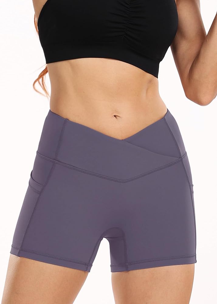 • Crossover High Waisted Gym Shorts with Sexy slimming criss cross v waist, Tummy control squat proof cycling shorts, Supportive ribbed overlapping waistband, Pass the squat test