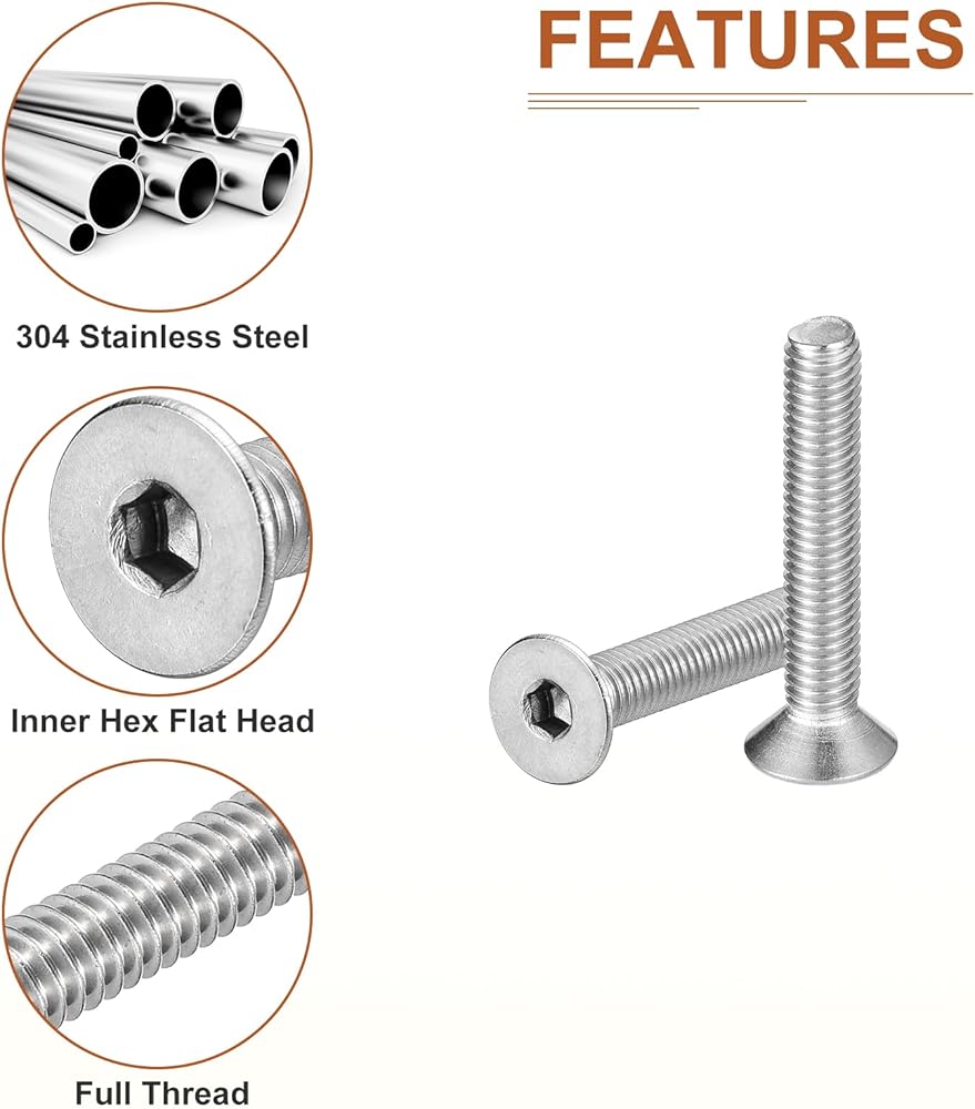 [Feature]: The flat head machine screws are very strong and are great for both indoor and outdoor use. This stainless is superior to regular steel and provides excellent rust resistance.