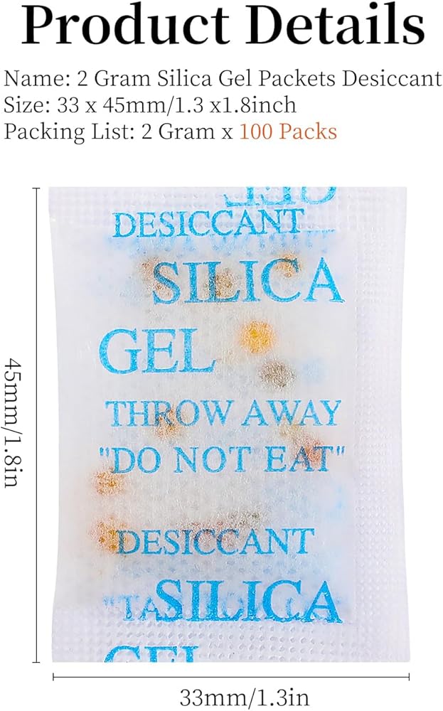 Premium Silica Gel Packets: Made of transparent silica gel beads and high-quality non-woven fabric, these desiccant packs are non-toxic, cobalt chloride-free, and ideal for moisture control in various applications. They are safe, non-toxic, and versatile for everyday use.