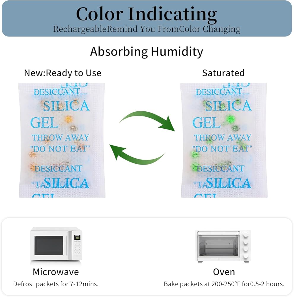 Reusable Desiccant Packs: Easily reactivate these desiccant packs using an oven, microwave, or sunlight for continued use. They are suitable for multiple applications, including moisture control and humidity regulation.