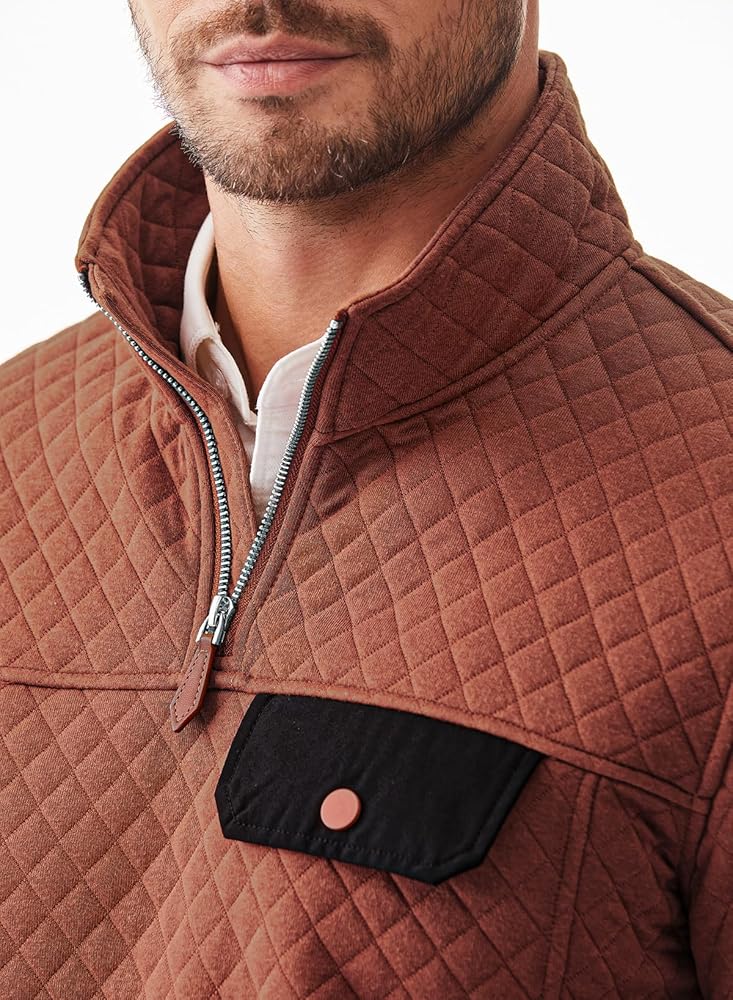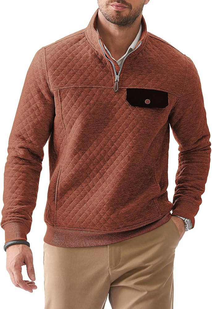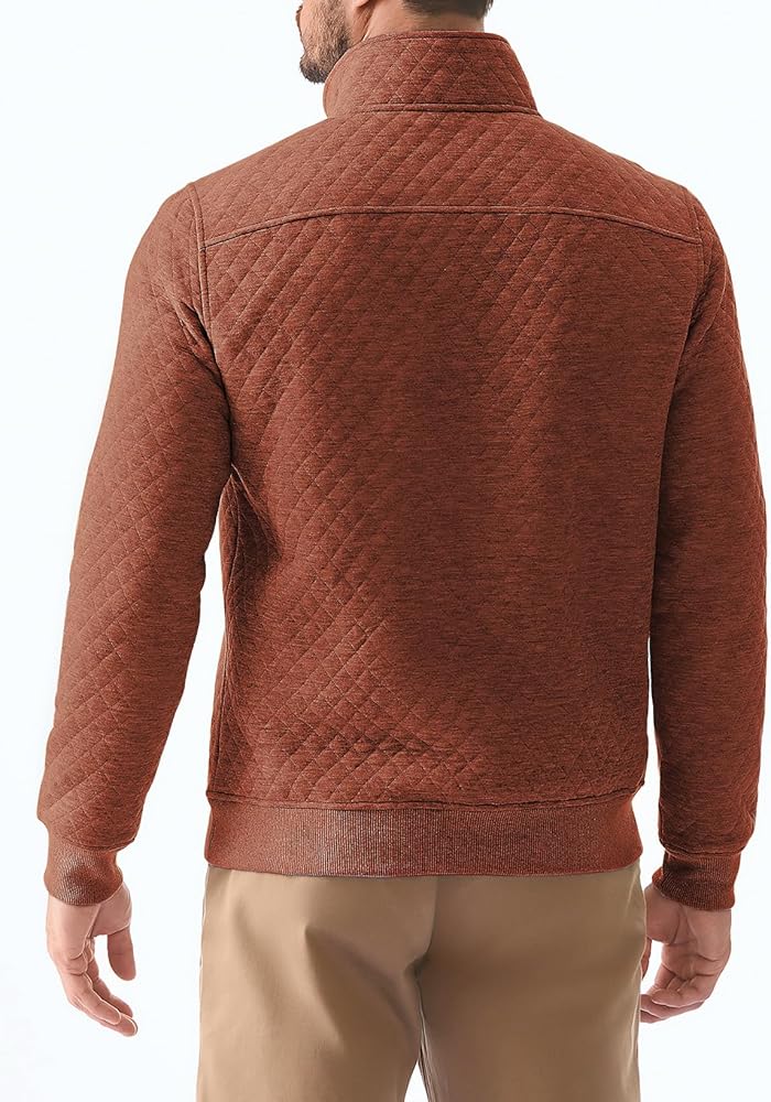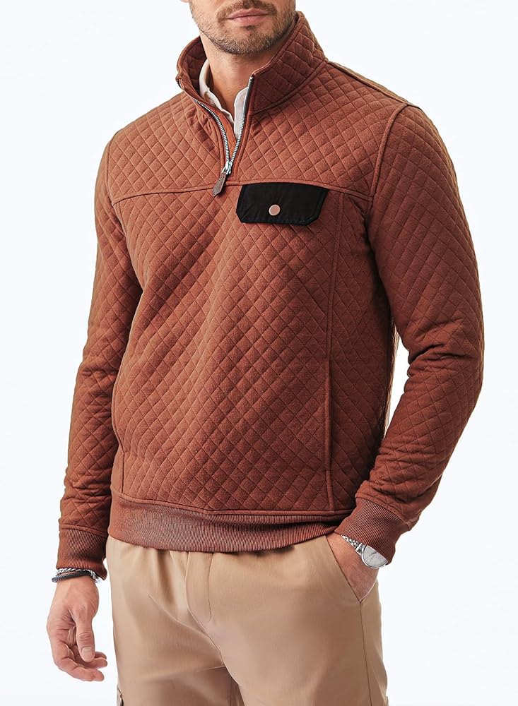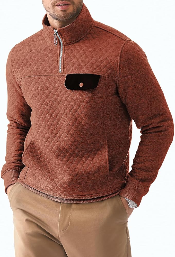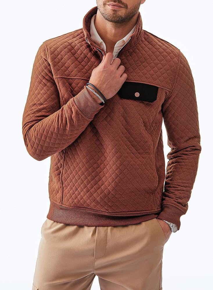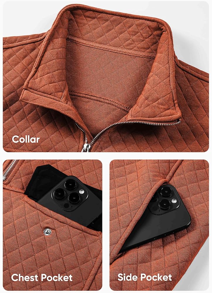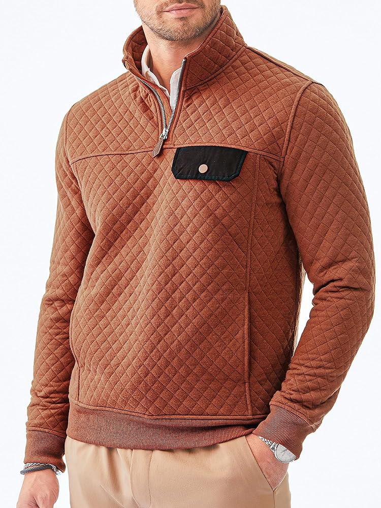 Material: Men's Long Sleeve Crewneck Quilted Sweatshirt, Lightweight Warm Fabric, Great for Fall and Winter.