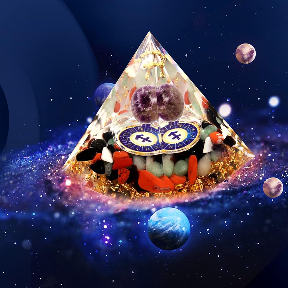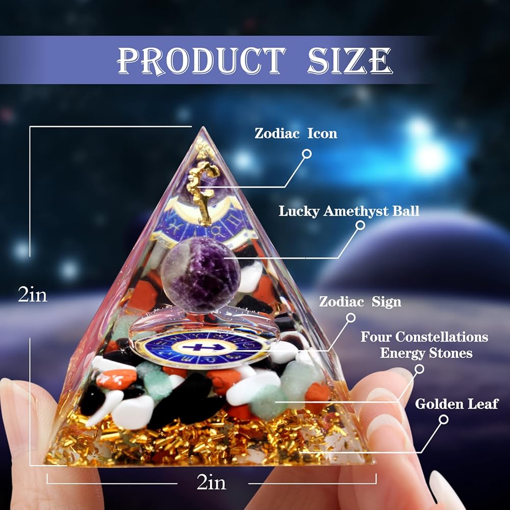 💎LUMINOUS CRYSTAL CONSTELLATION ORGONE PYRAMID Orgone Pyramid is a combination of a metal star chart, an amethyst sphere, a luminous constellation symbol, four types of constellation guardian crystals that is sealed in high transparent resin. The four types constellation guardian crystals contain great energies.They are able to accelerate brain cell activities, keep physical health.All these will help to purify our souls, attract wealth and exorcise evil spirits.