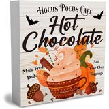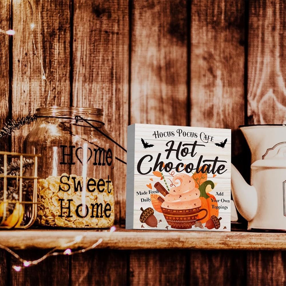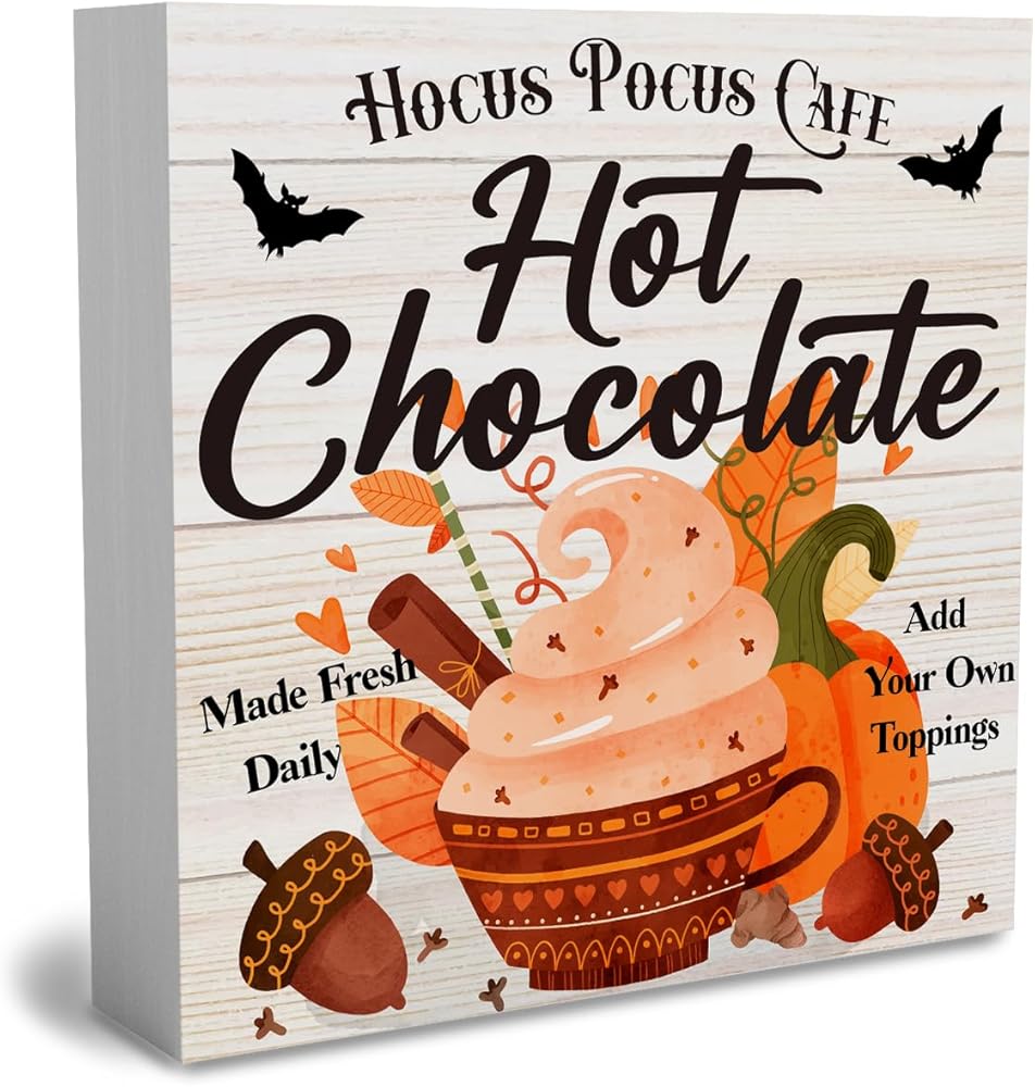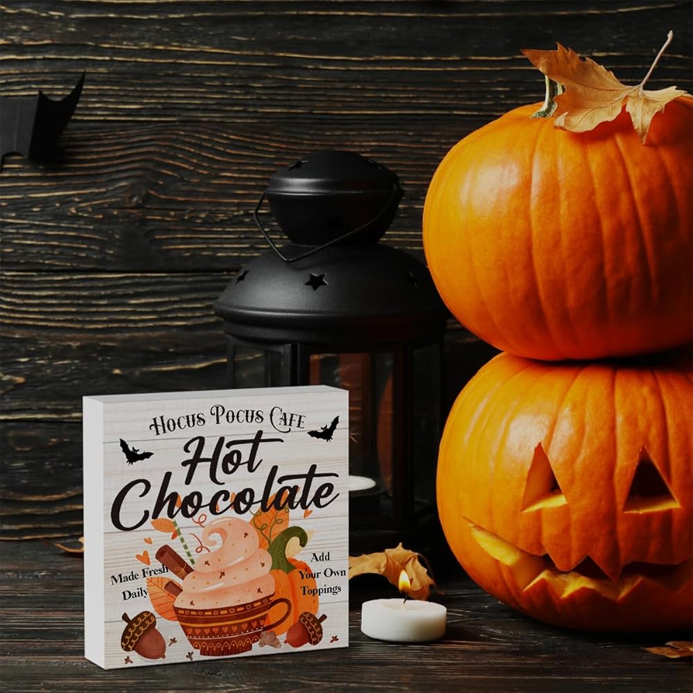Hot Chocolate Pumpkin Wall Art Halloween Wooden Box Sign Cute Fall Sign Decor Farmhouse Decorative Wood Box Sign Block Plaque for Wall Desk Home Bathroom Decoration 5 x 5 Inches