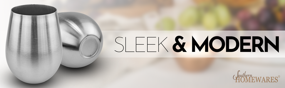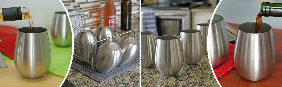 Southern Homewares presents a modern take on a classic design with our stemless stainless steel wine glass! Not only does the stainless steel construction provide a sleek and contemporary look with its satin finish, It also has many structural advantages over traditional glass. The metal keeps cold beverages cool for longer so you can enjoy your drink of choice knowing it will stay at the perfect temperature. No need to worry about it breaking, either! These stemless glasses are shatterproof and virtually unbreakable so they work well in almost any environment Whether it be outside, by the pool, camping, or even near kids. Each glass is made of high quality 18/8 stainless steel and holds 18oz. Dishwasher safe. Dimensions: 3. 52” in diameter (at its widest) and is 4. 57” tall. Opening diameter is 2. 59”. comes with 4 glasses.