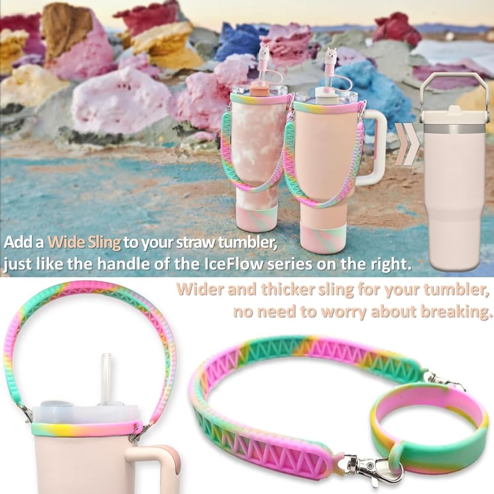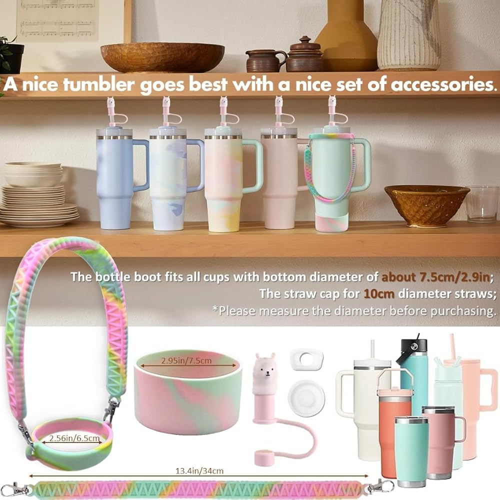 💡 【Unique style Cup accessories Set】This is a perfectly matched tumbler accessories combination, through the silicone mixed color tie-dye design, to show a stylish and cute look. 🥤SetB Includes: silicone boot*1, water bottle sling*1, stanley spill stopper*1,and straw cover cap*1.