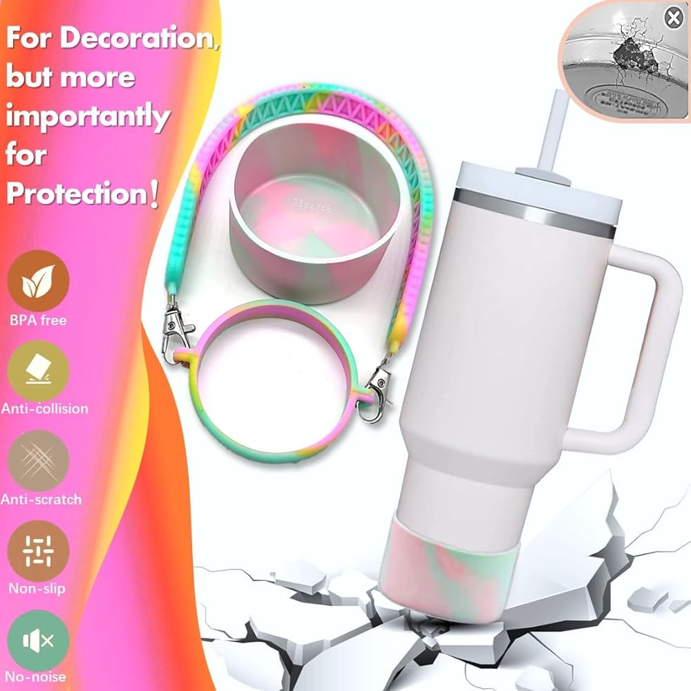 Introducing the ultimate accessory set for your Stanley Cup tumbler! Our unique style and perfectly matched accessories combination includes a Stanley Cup holder, bottom silicone boot, and stanley spill stopper. Keep your tumbler protected with our silicone bottom protector, while also adding a pop of pink mixed color with water bottle sling. The Stanley Cup strap provide added convenience and comfort for carrying your tumbler on the go. Upgrade your tumbler game with our Stanley Cup accessories set, designed specifically for the stanley 30&40oz or versions1.0&2.0, and any other cup that fits the size.